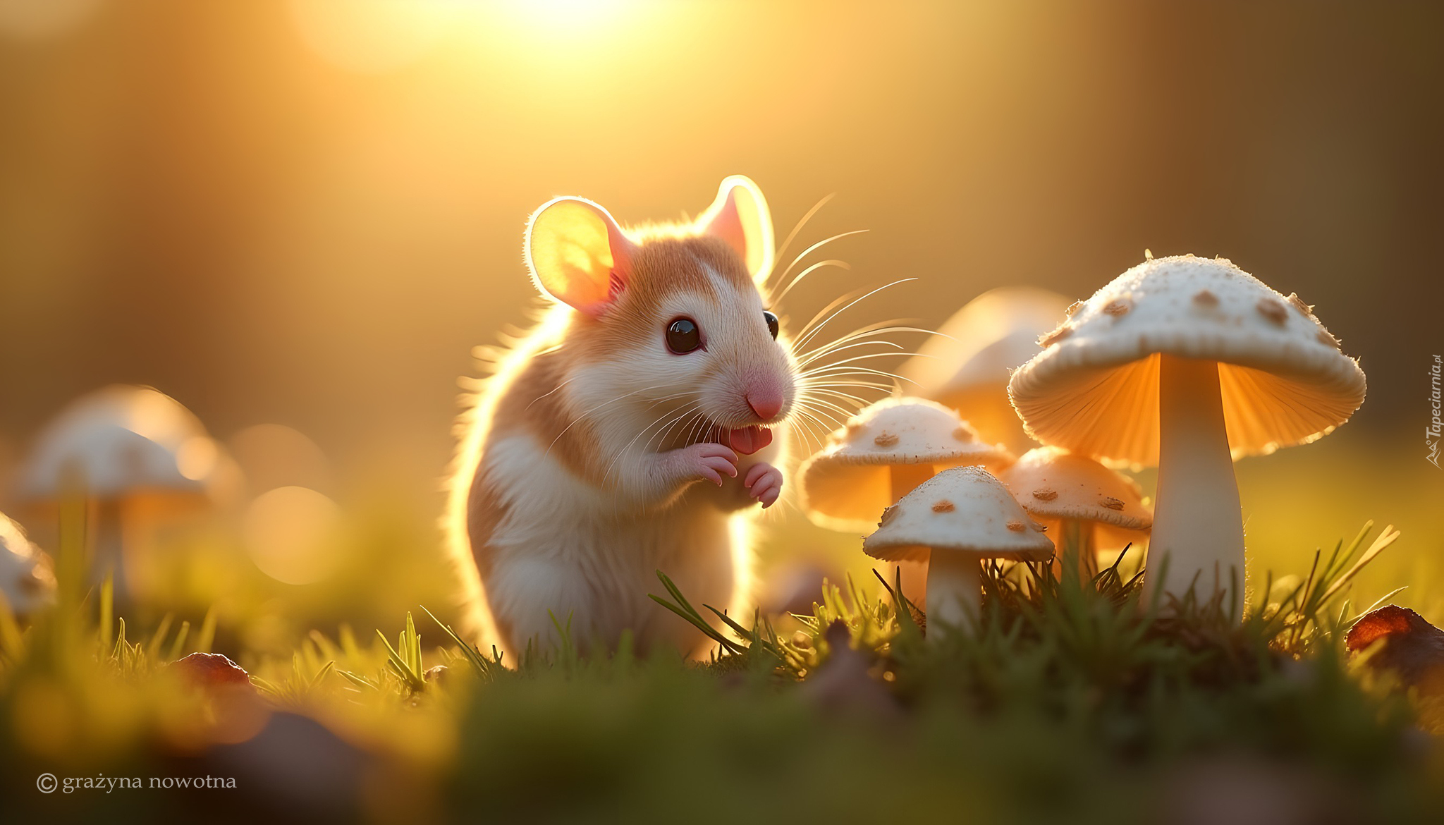 Edytor tapety: Myszka obok białych grzybków w grafice