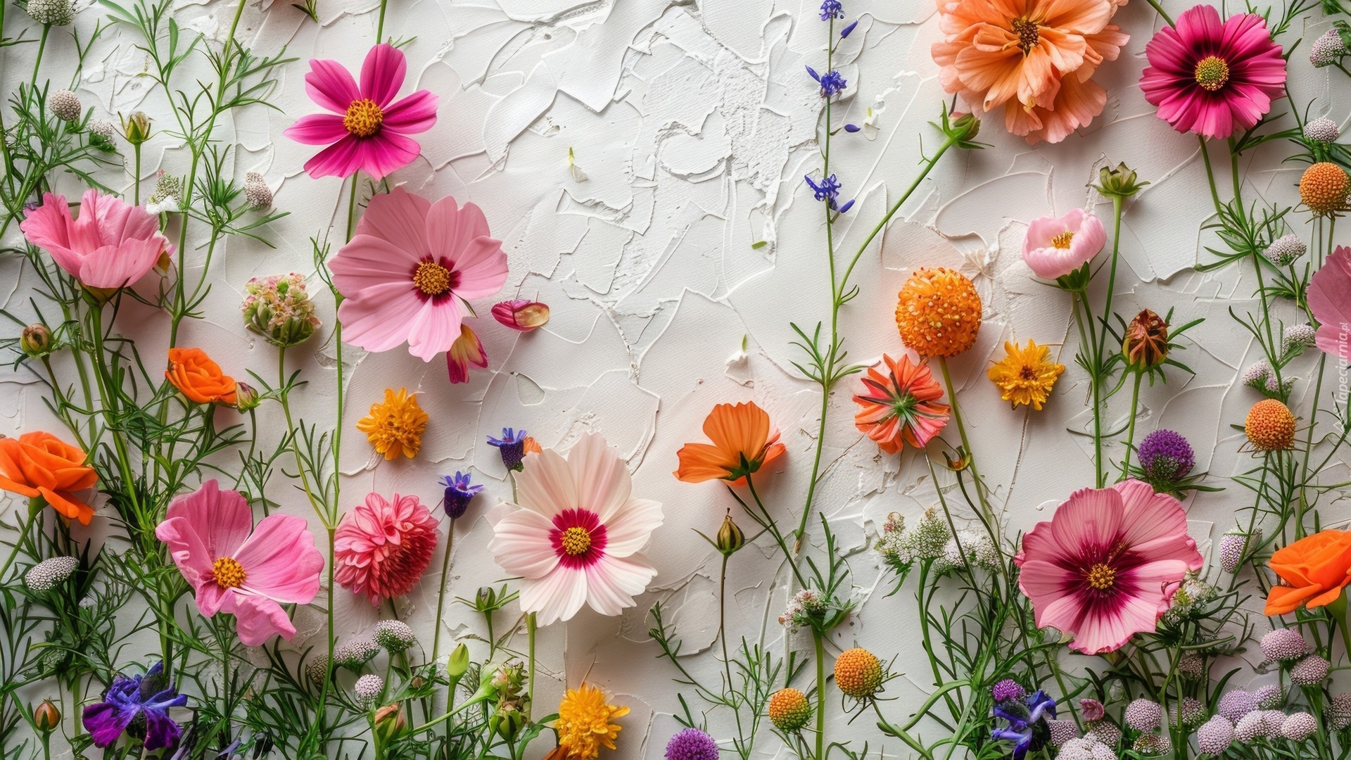 Edytor tapety: Kosmea i inne kolorowe kwiaty na jasnym tle