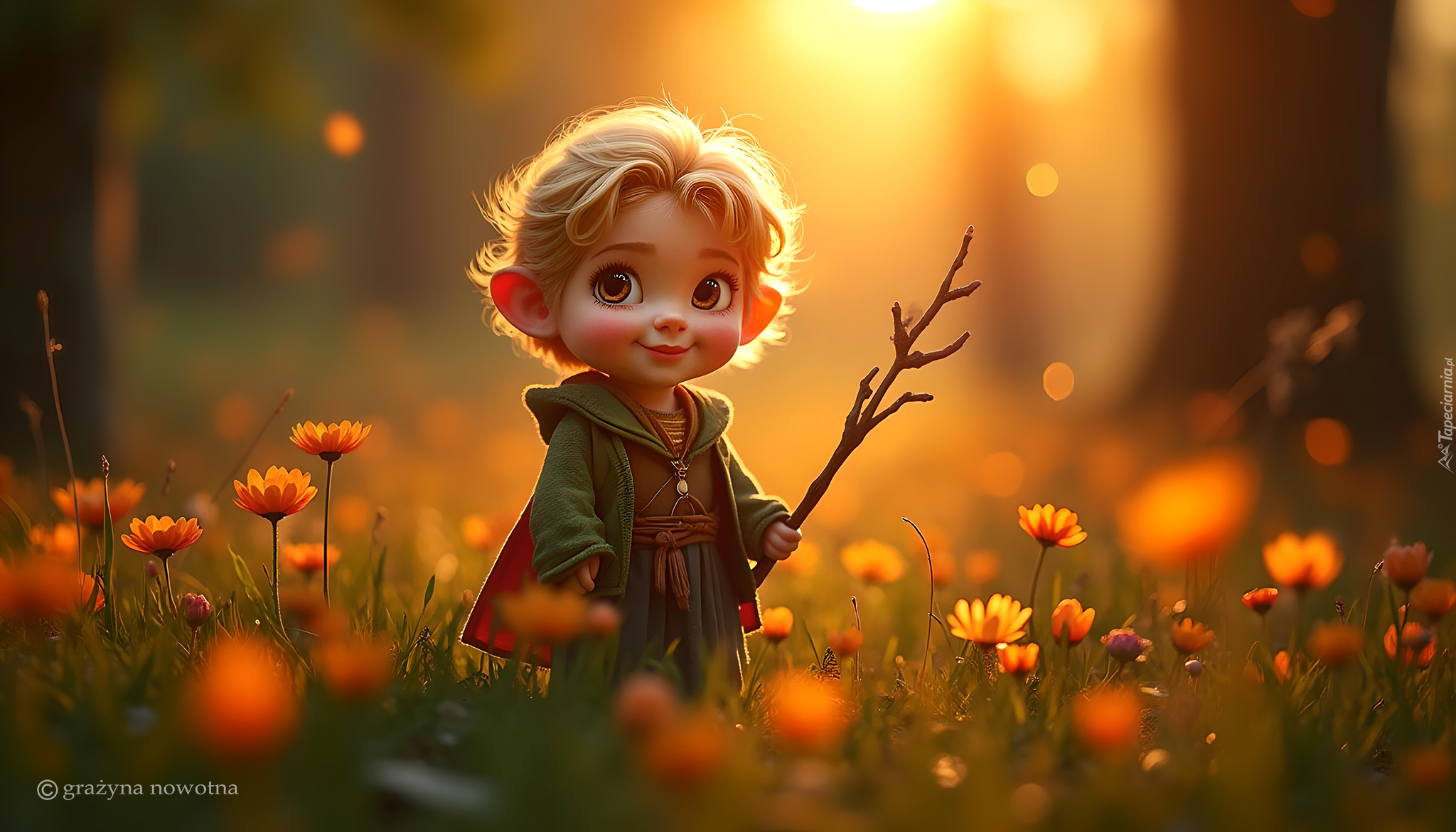 Edytor tapety: Hobbit wśród kwiatów pod drzewami w słonecznym blasku