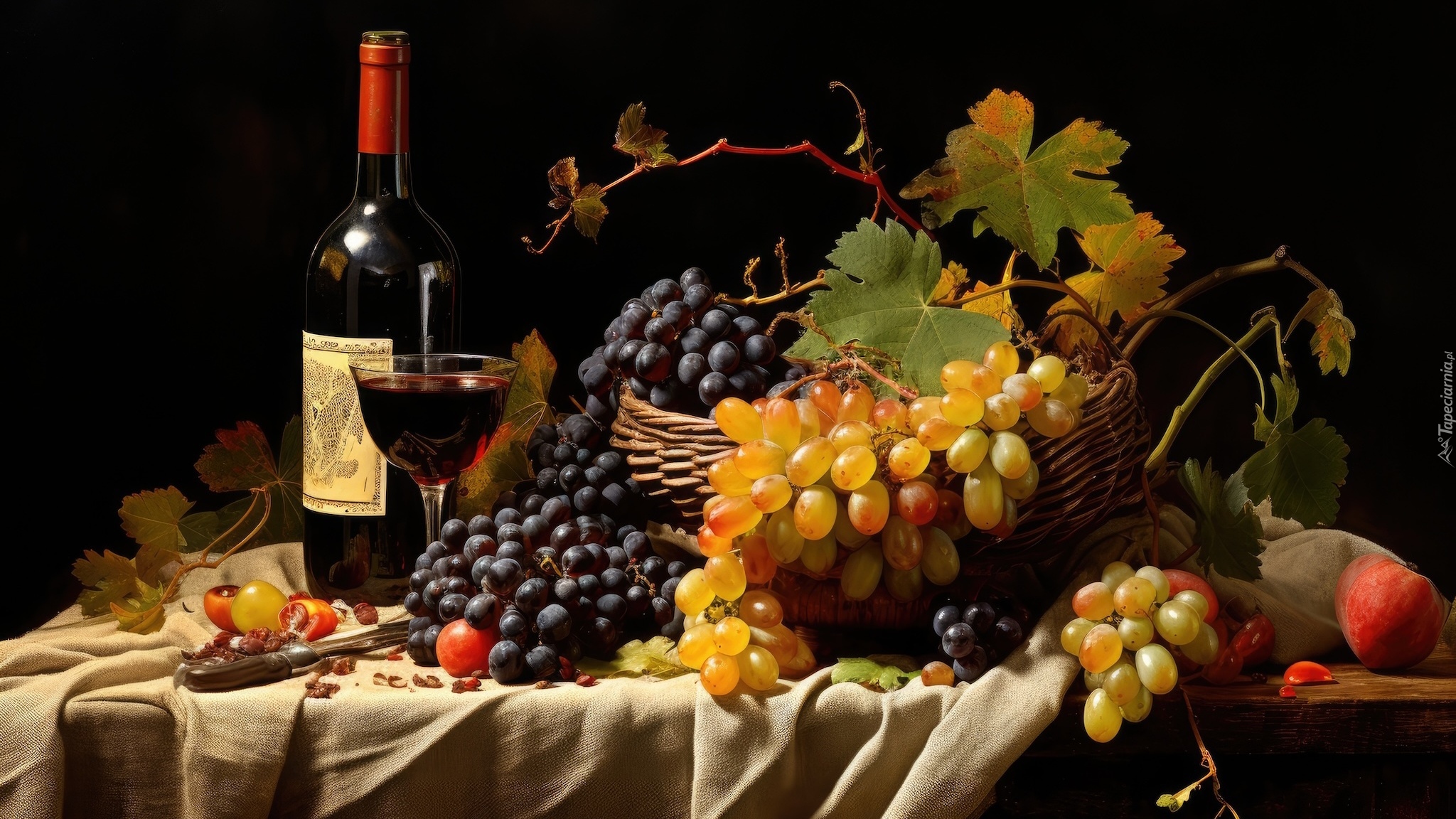 Edytor tapety: Wino i kieliszek obok kosza z winogronami