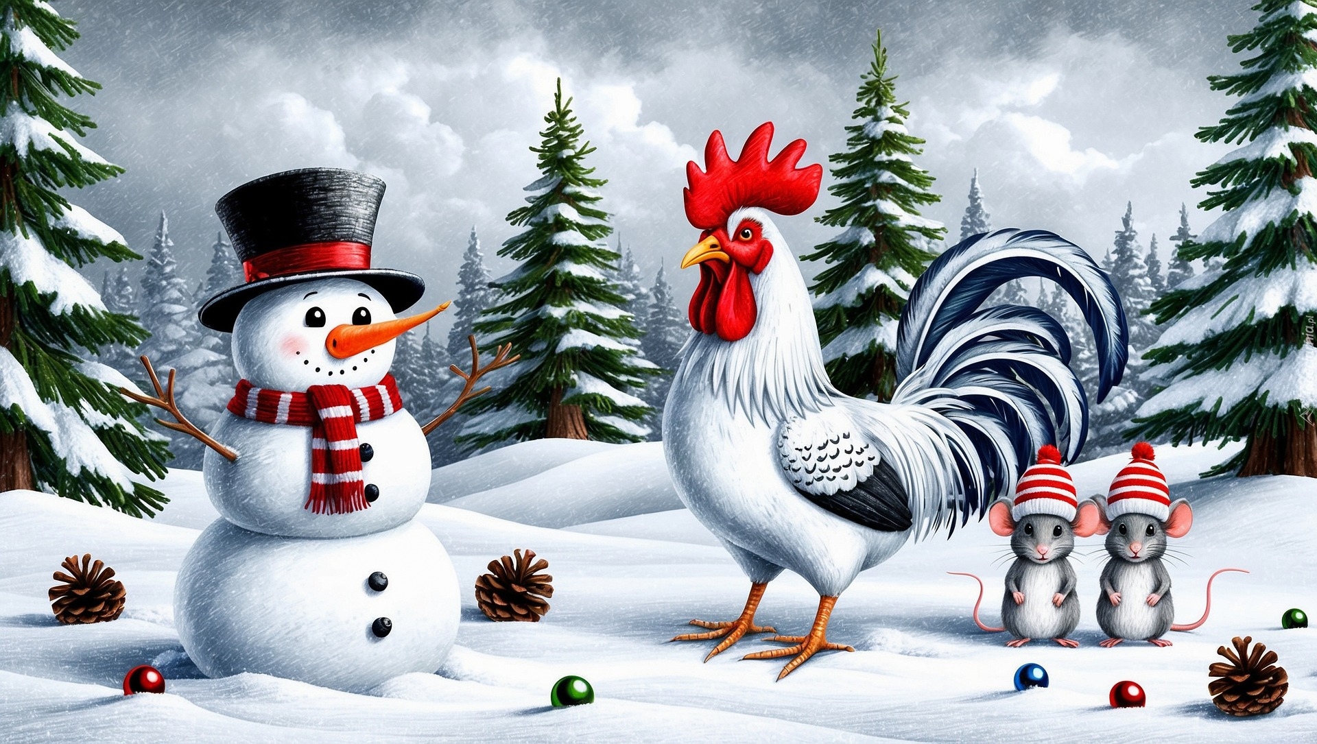 Edytor tapety: Bałwan i kogut z myszami w zimowej scenerii