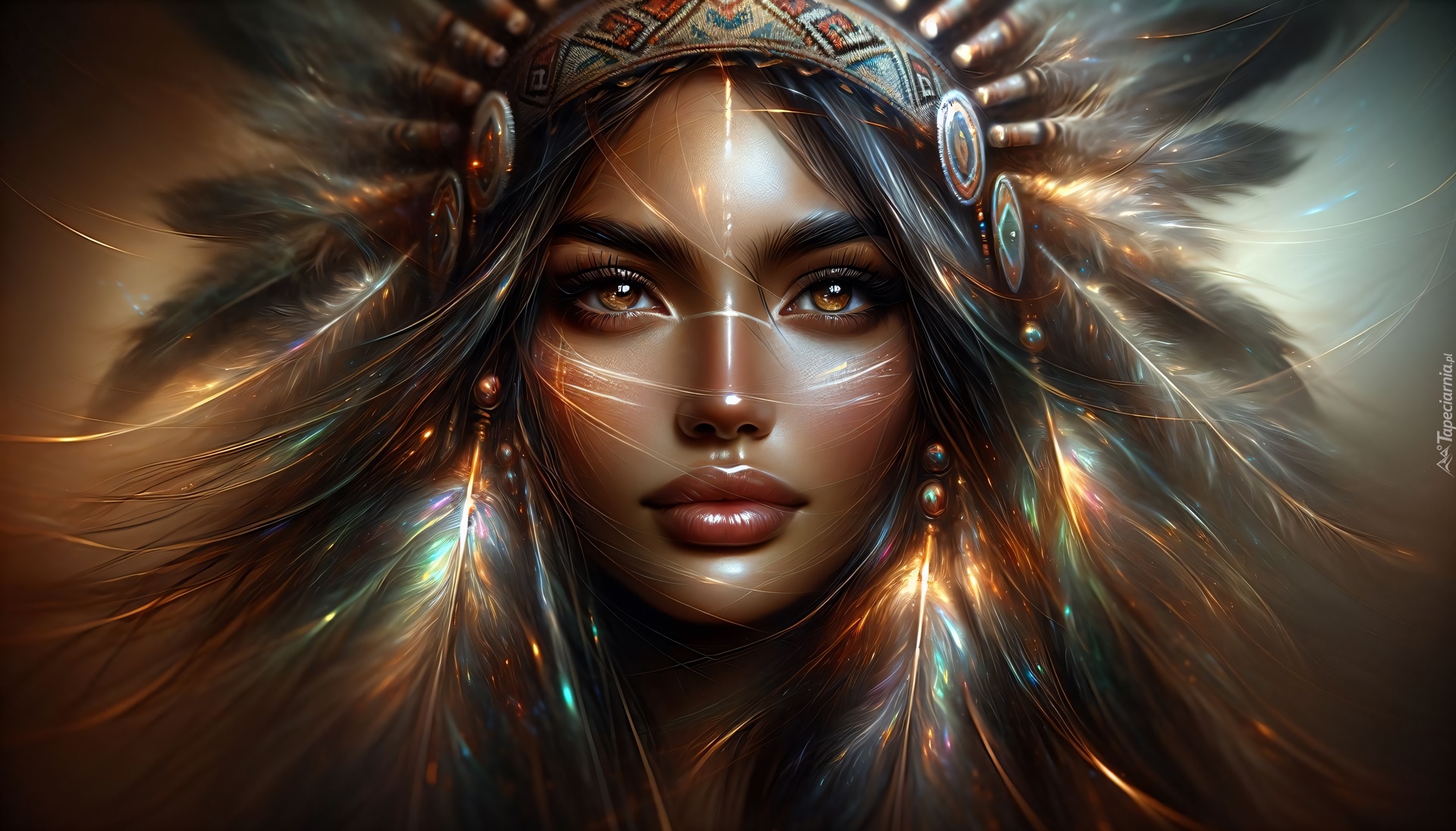 Edytor tapety: Twarz kobiety w pióropuszu w grafice