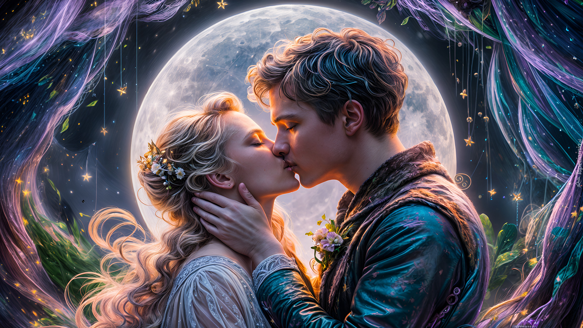 Edytor tapety: Pocałunek zakochanych na tle księżyca w grafice