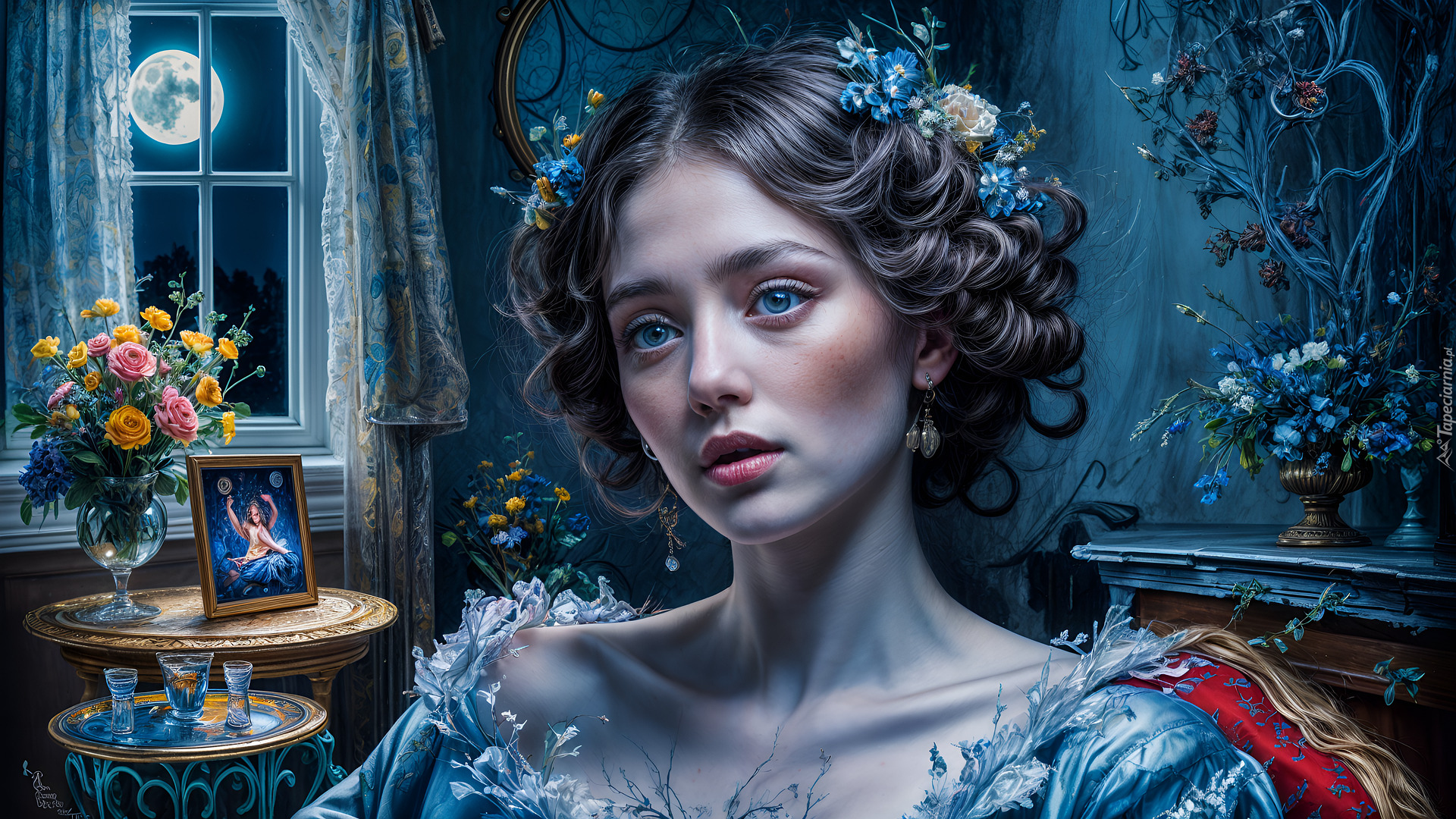 Edytor tapety: Kobieta siedząca w fotelu przy oknie nocną porą