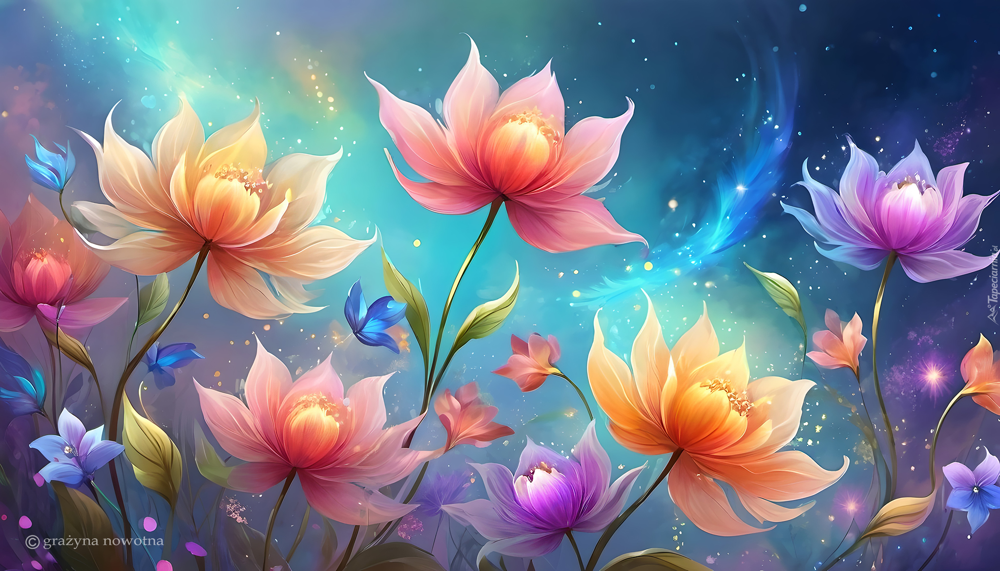 Edytor tapety: Grafika z rozkwitniętymi kolorowymi kwiatami
