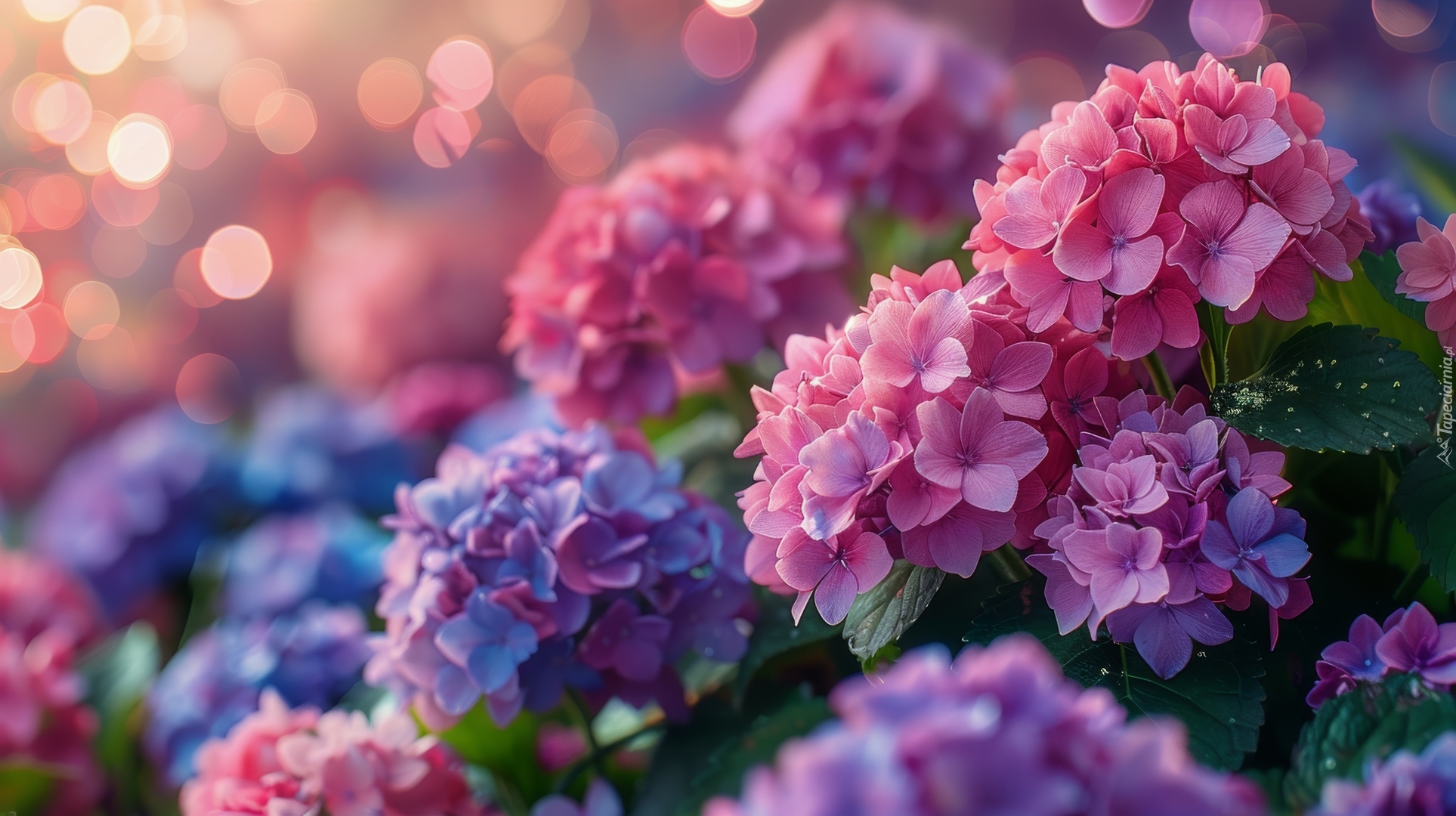 Edytor tapety: Rozkwitnięte kolorowe hortensje w blasku światła