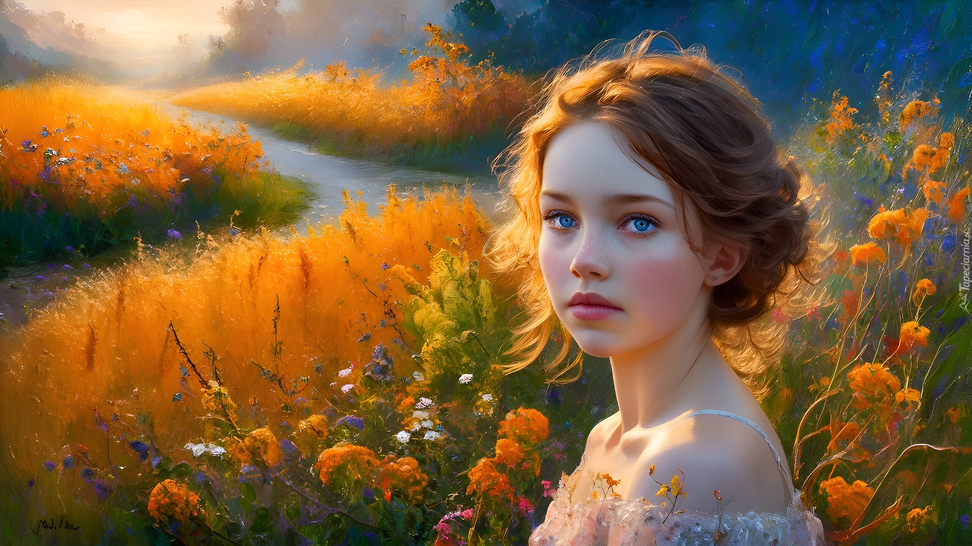 Edytor tapety: Twarz niebieskookiej dziewczyny na tle łąki