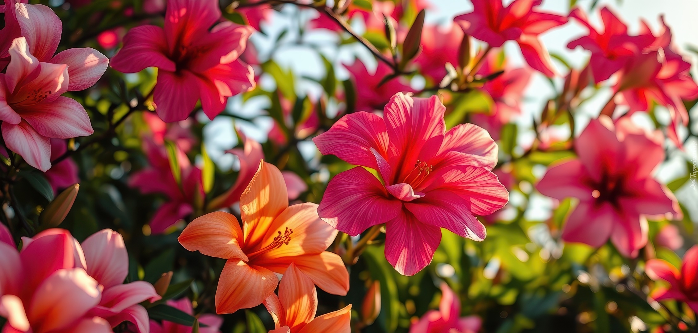 Edytor tapety: Rozświetlone światłem kolorowe kwiaty i liście