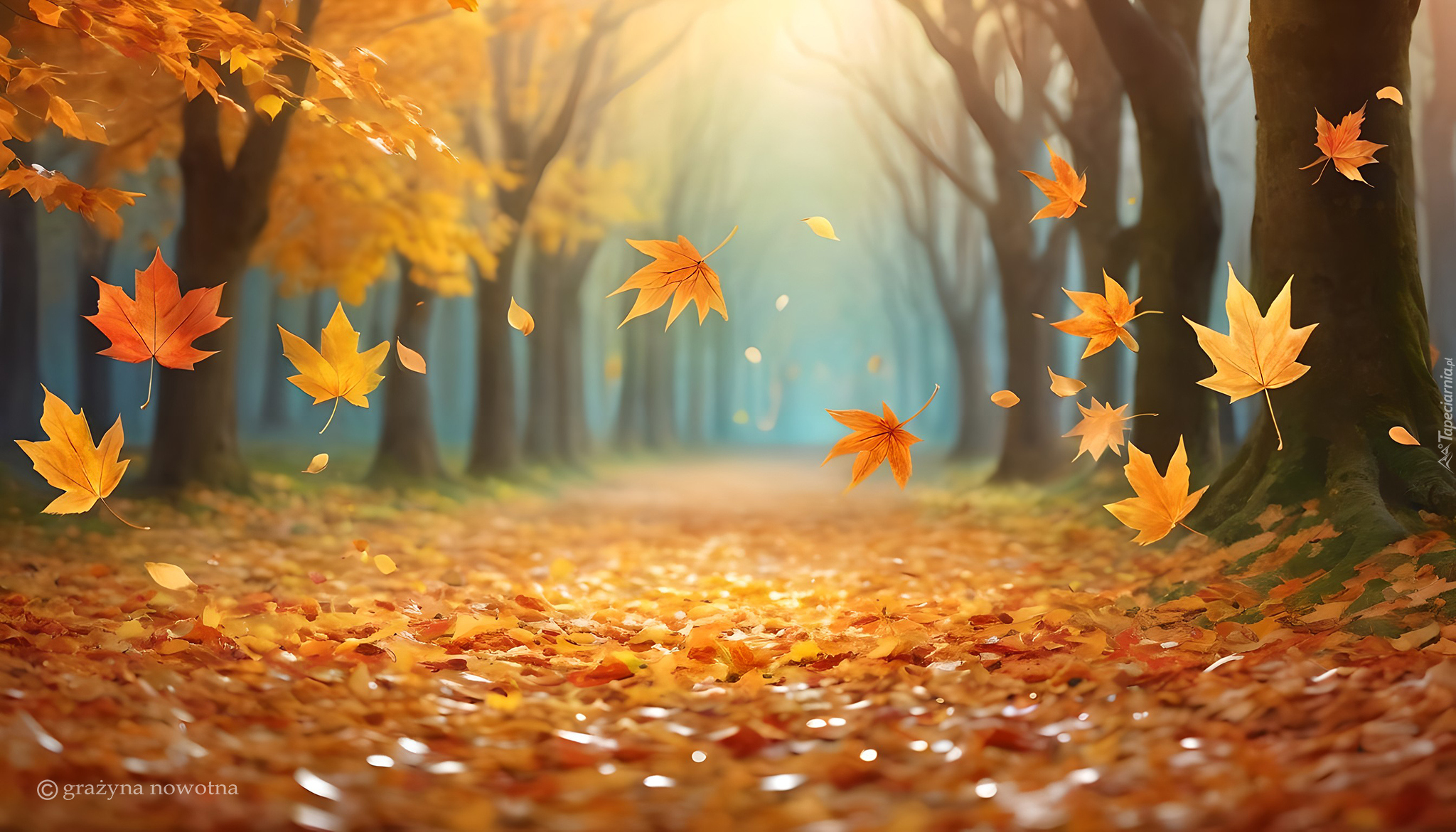 Edytor tapety: Spadające liście i drzewa w zamglonym jesiennym parku