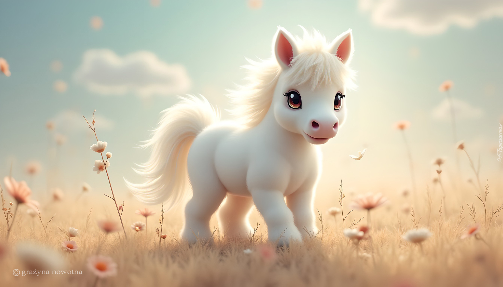 Edytor tapety: Grafika z białym konikiem wśród kwiatów