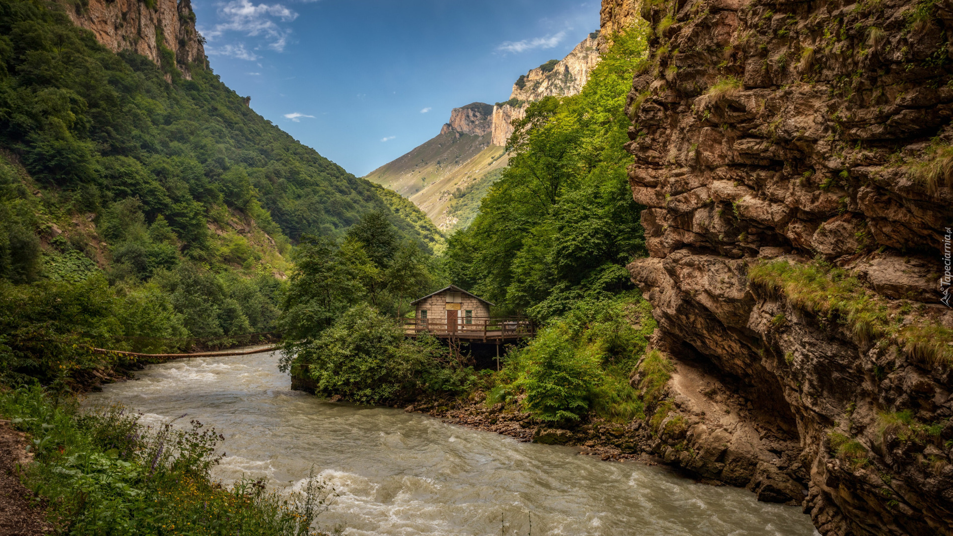 Edytor tapety: Dom i most nad rzeką w wąwozie Chegem