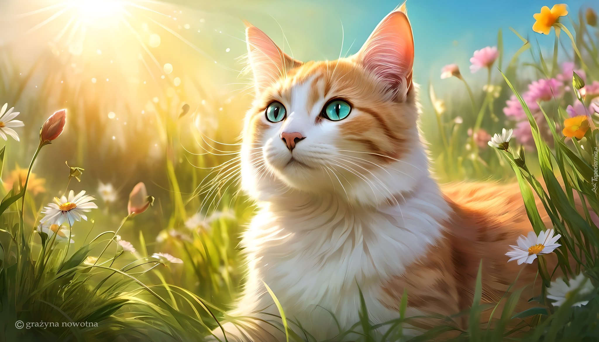 Edytor tapety: Rudawy kot leżący wśród kwiatów na łące