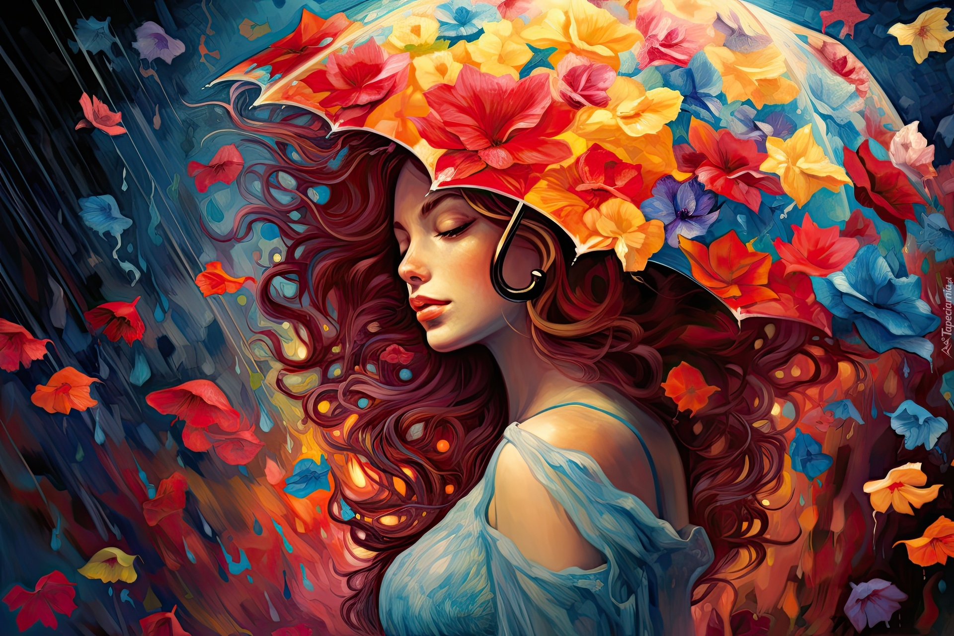 Edytor tapety: Rudowłosa kobieta pod parasolem w kwiaty w grafice