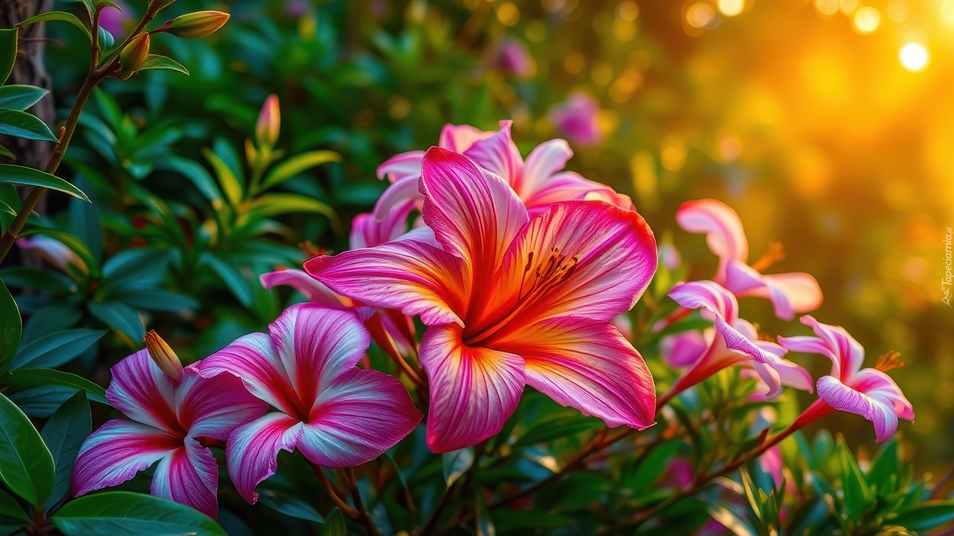 Edytor tapety: Różowe kwiaty i liście w słonecznym świetle