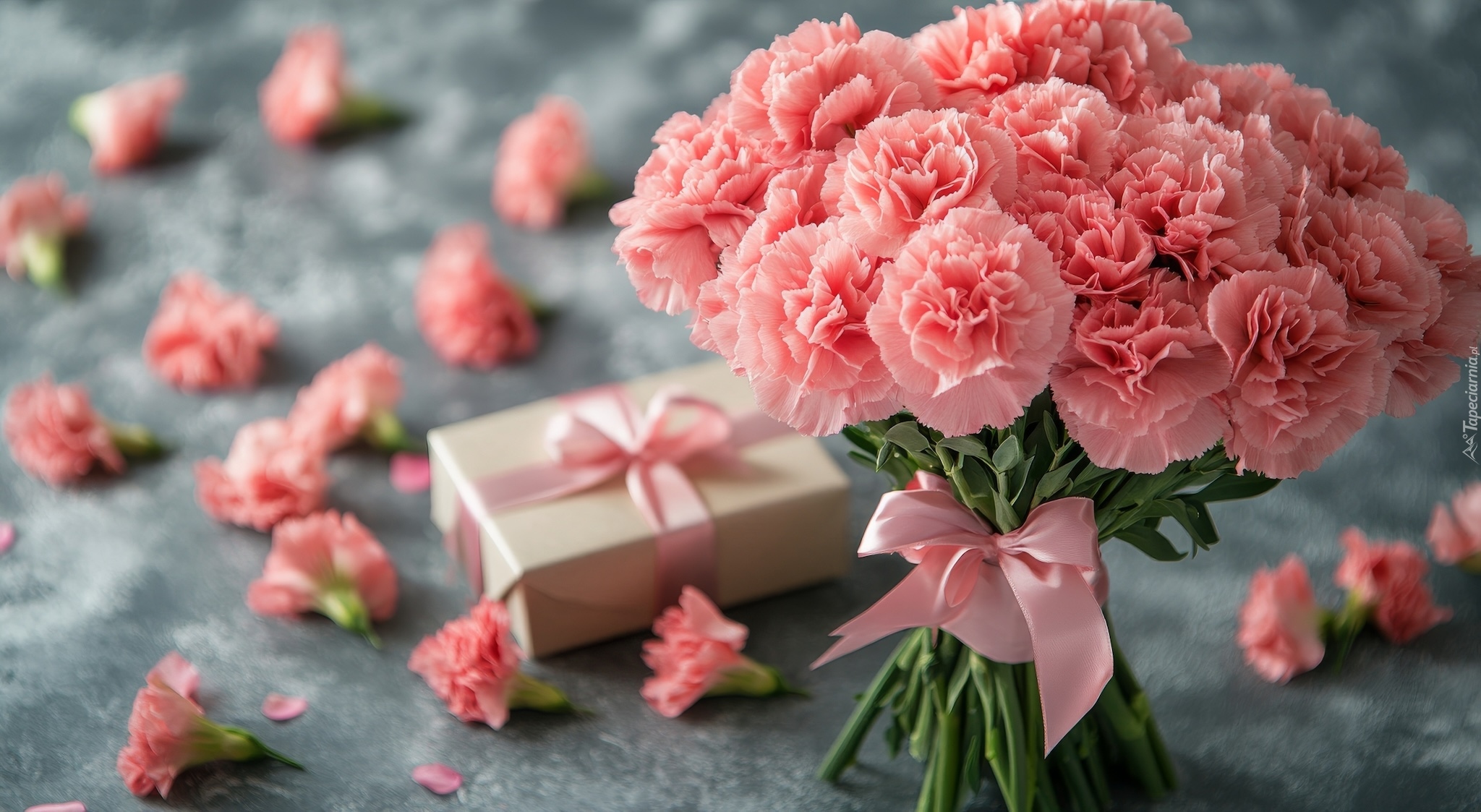 Edytor tapety: Prezent obok bukietu różowych goździków