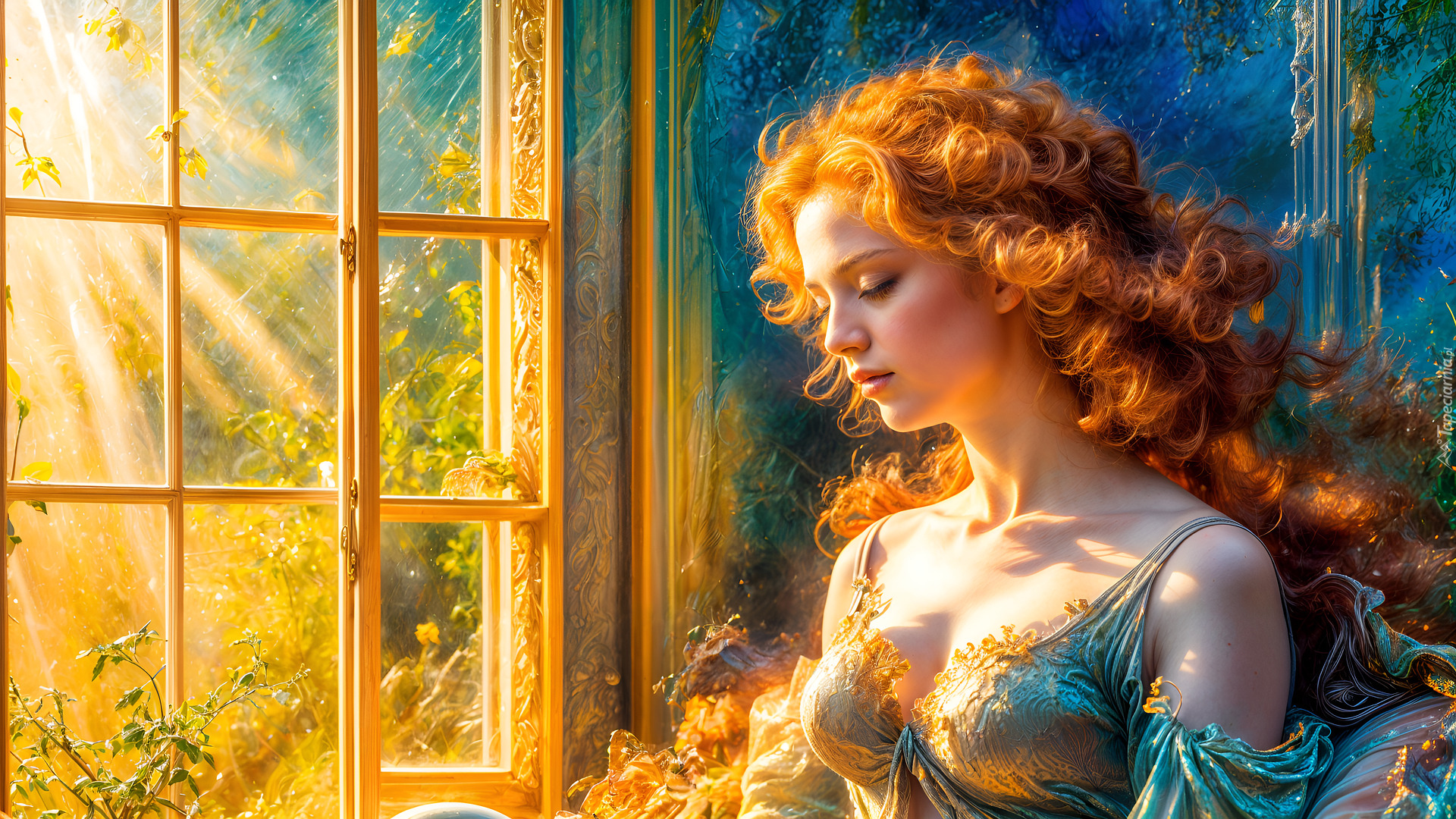 Edytor tapety: Rudowłosa kobieta w promieniach słońca wpadających przez okno