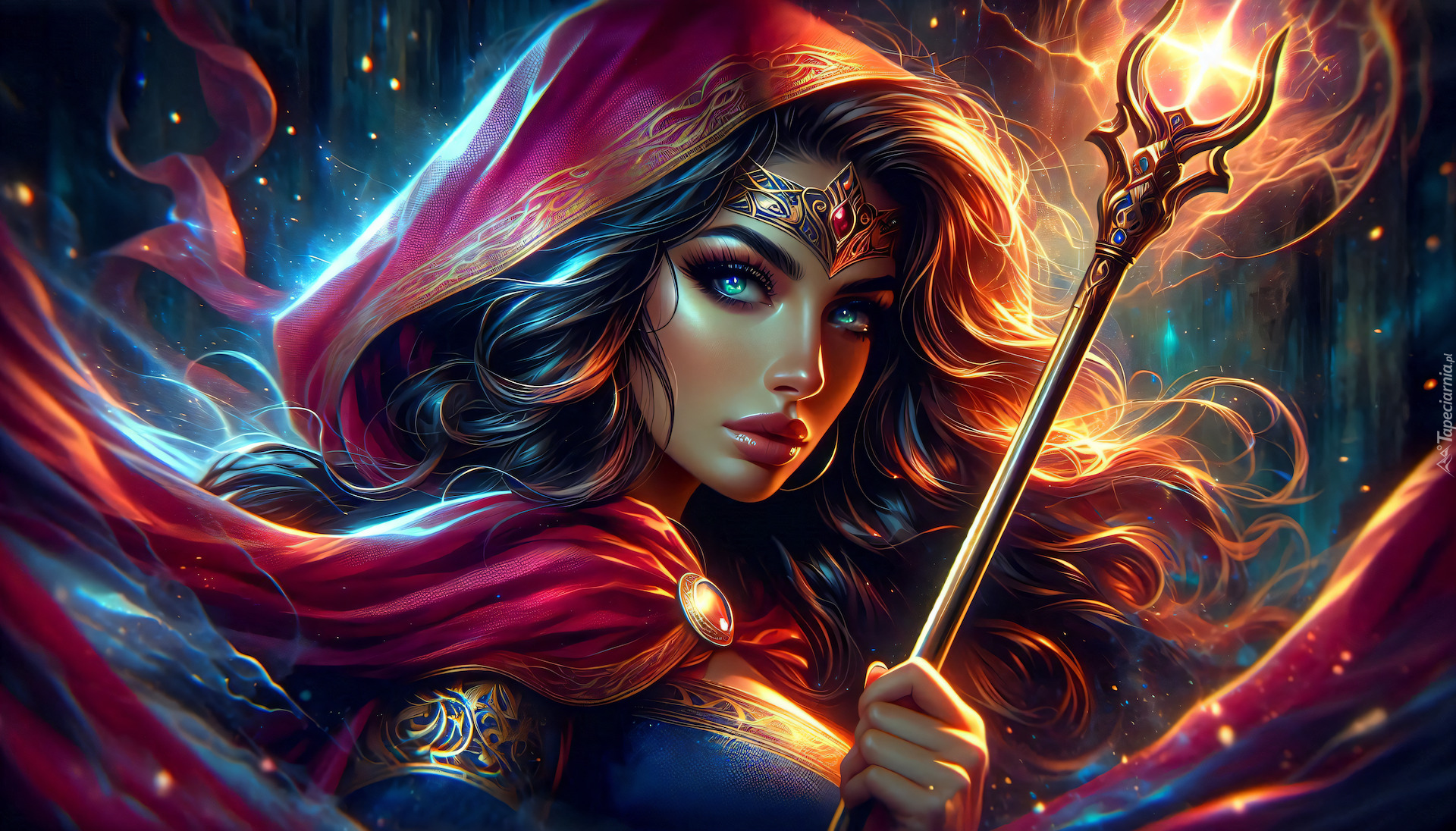Edytor tapety: Długowłosa kobieta w kapturze z czarodziejską różdżką