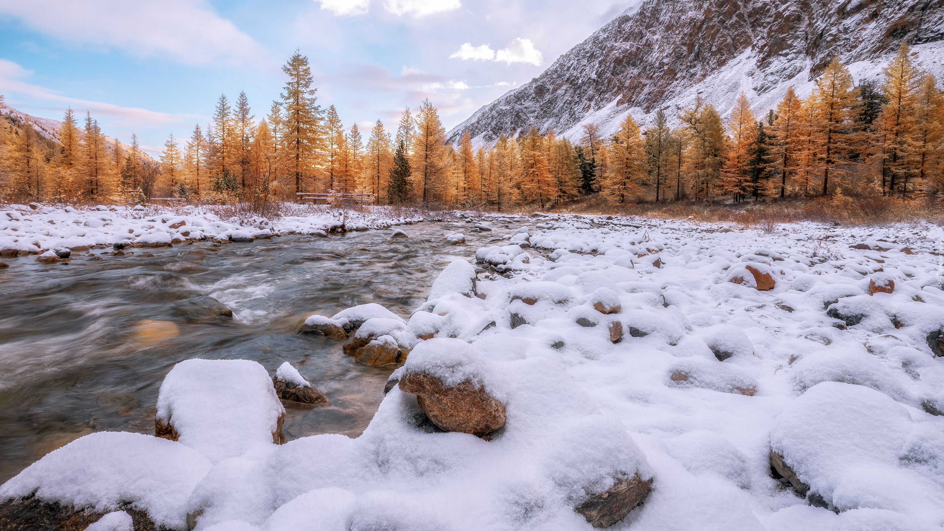 Edytor tapety: Pożółkłe drzewa i ośnieżone kamienie nad rzeką