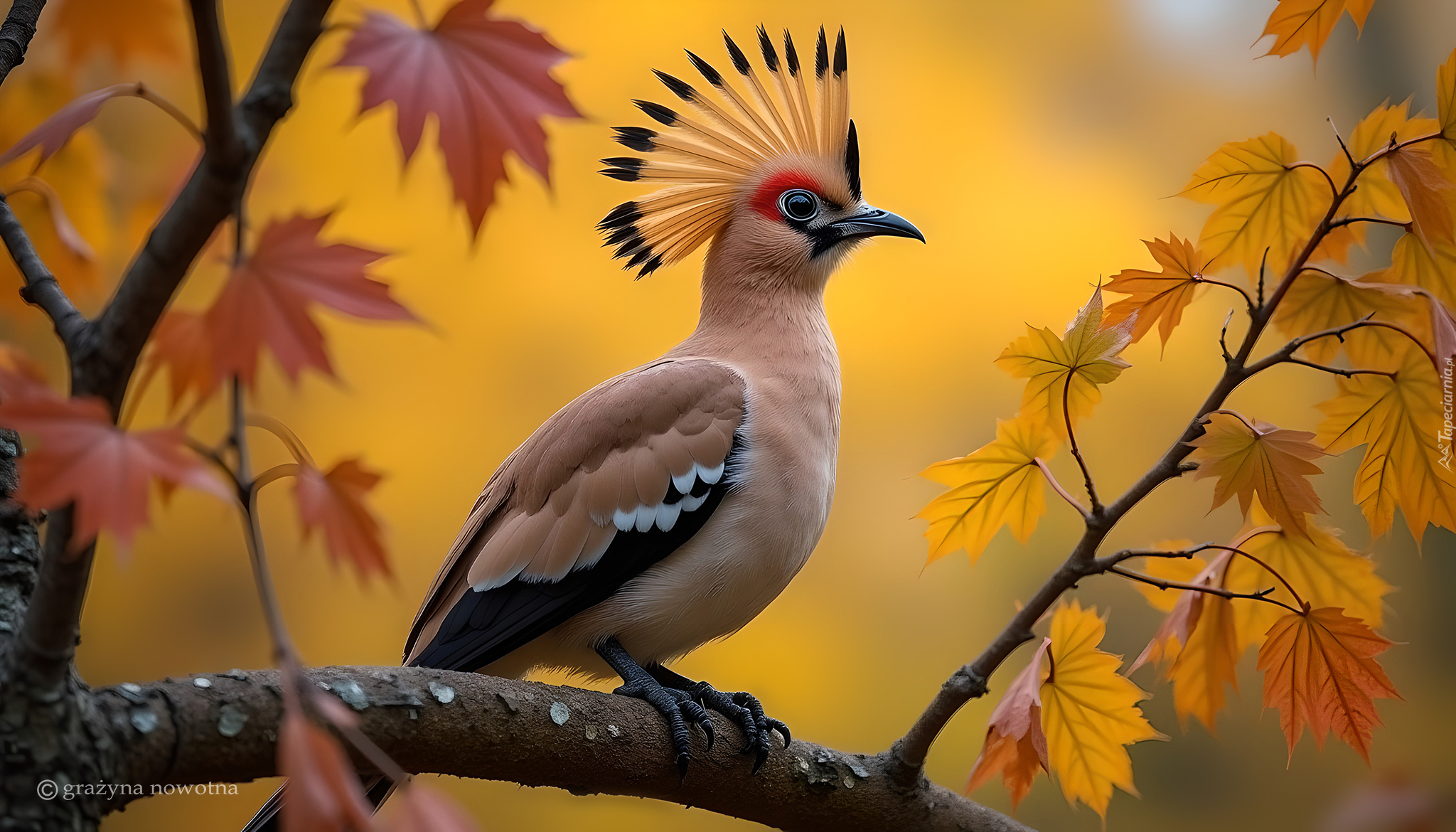 Edytor tapety: Dudek na gałązce z pożółkłymi liśćmi w grafice