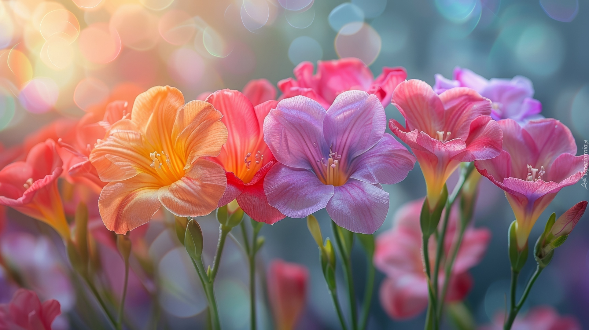 Edytor tapety: Rozświetlone blaskiem światła kolorowe kwiaty w grafice