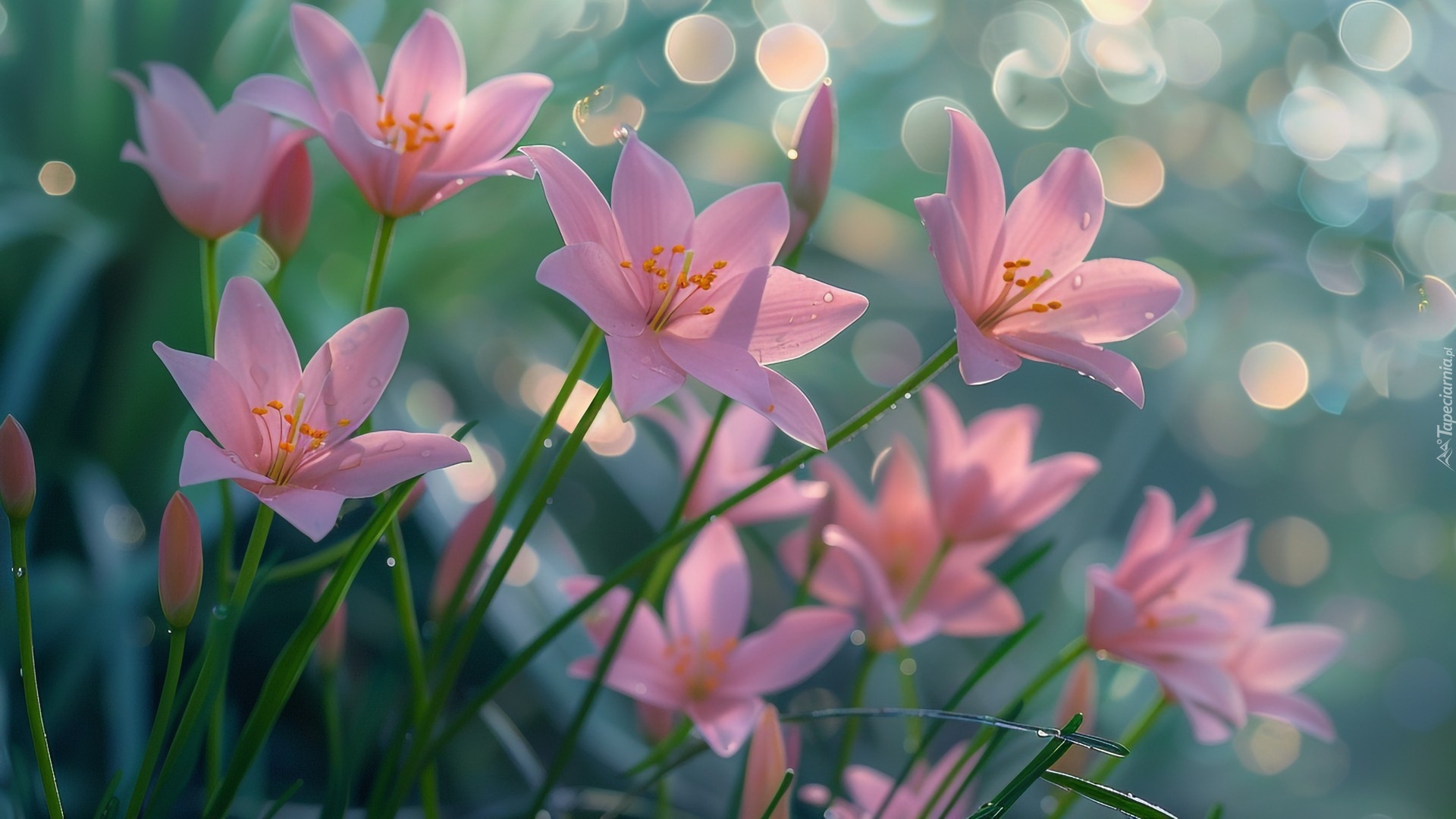 Edytor tapety: Krople na rozwiniętych różowych kwiatach
