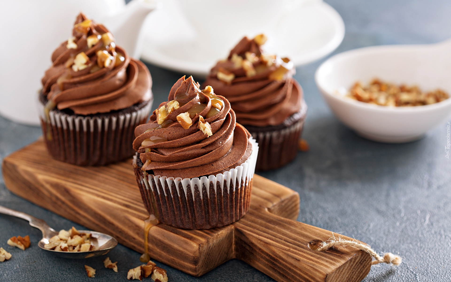 Edytor tapety: Babeczki z kremem i orzechami na desce