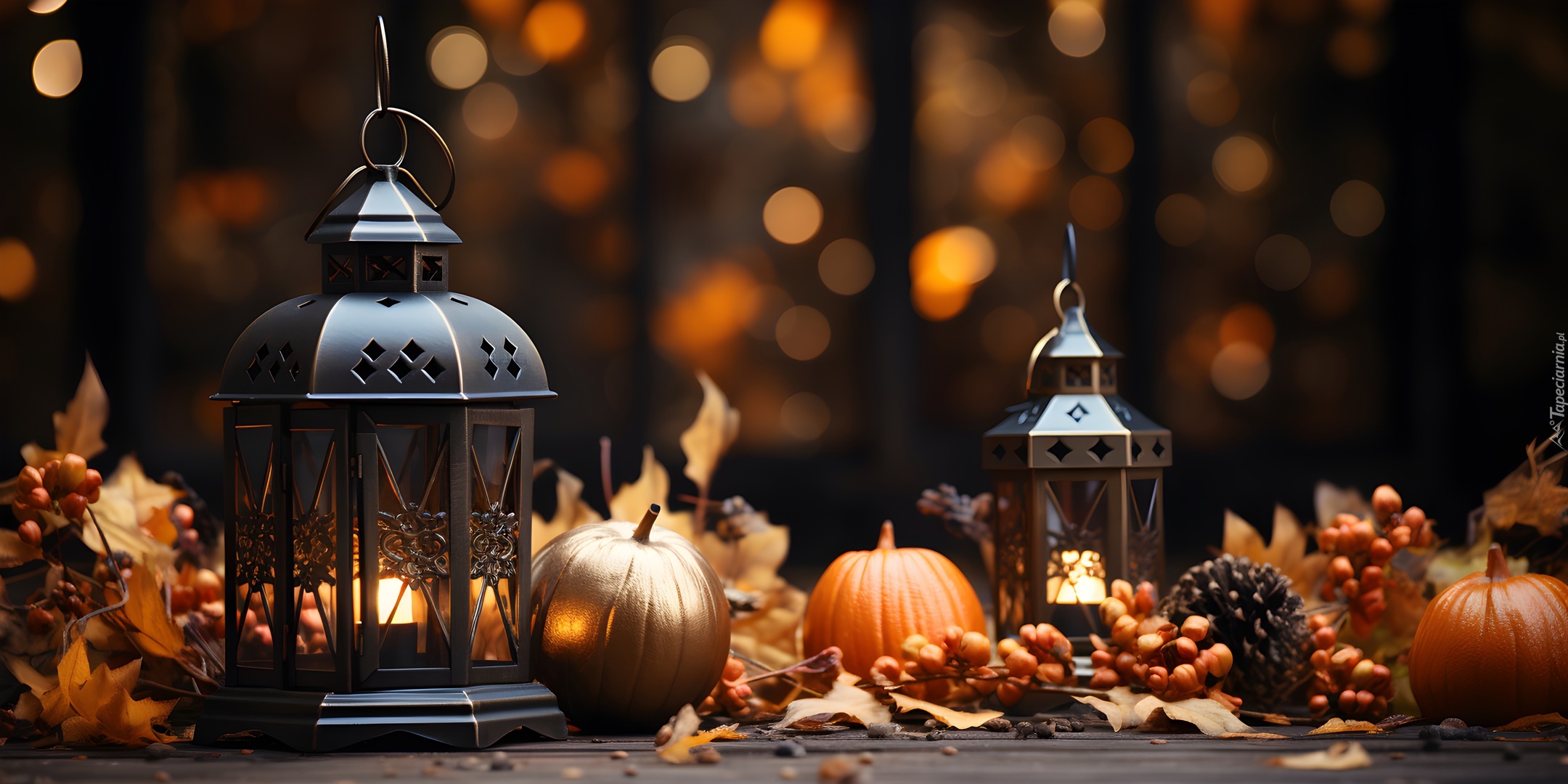 Edytor tapety: Lampiony i dynie w jesiennej kompozycji w grafice