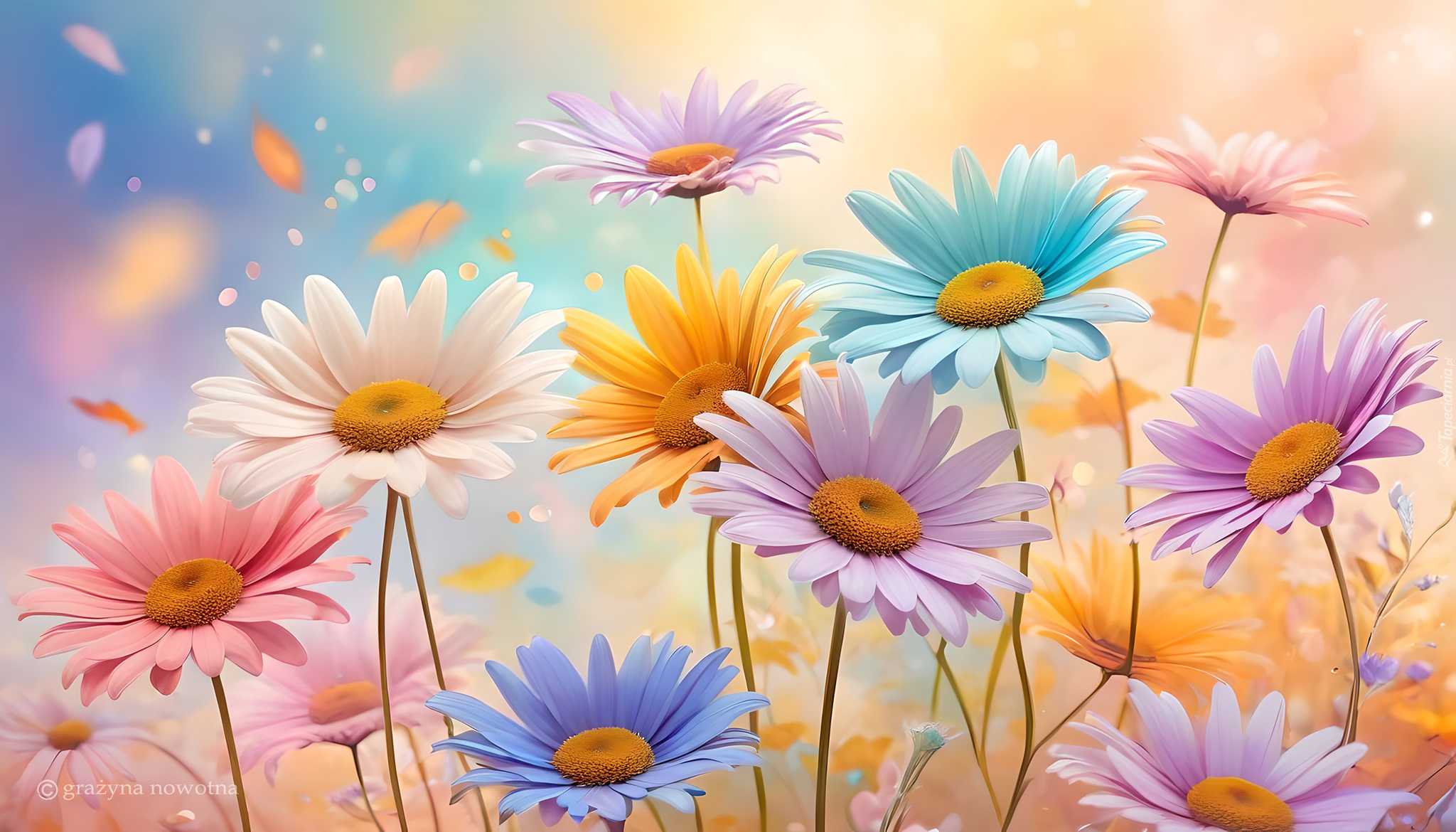 Edytor tapety: Rozkwitnięte kolorowe kwiaty na rozmytym tle