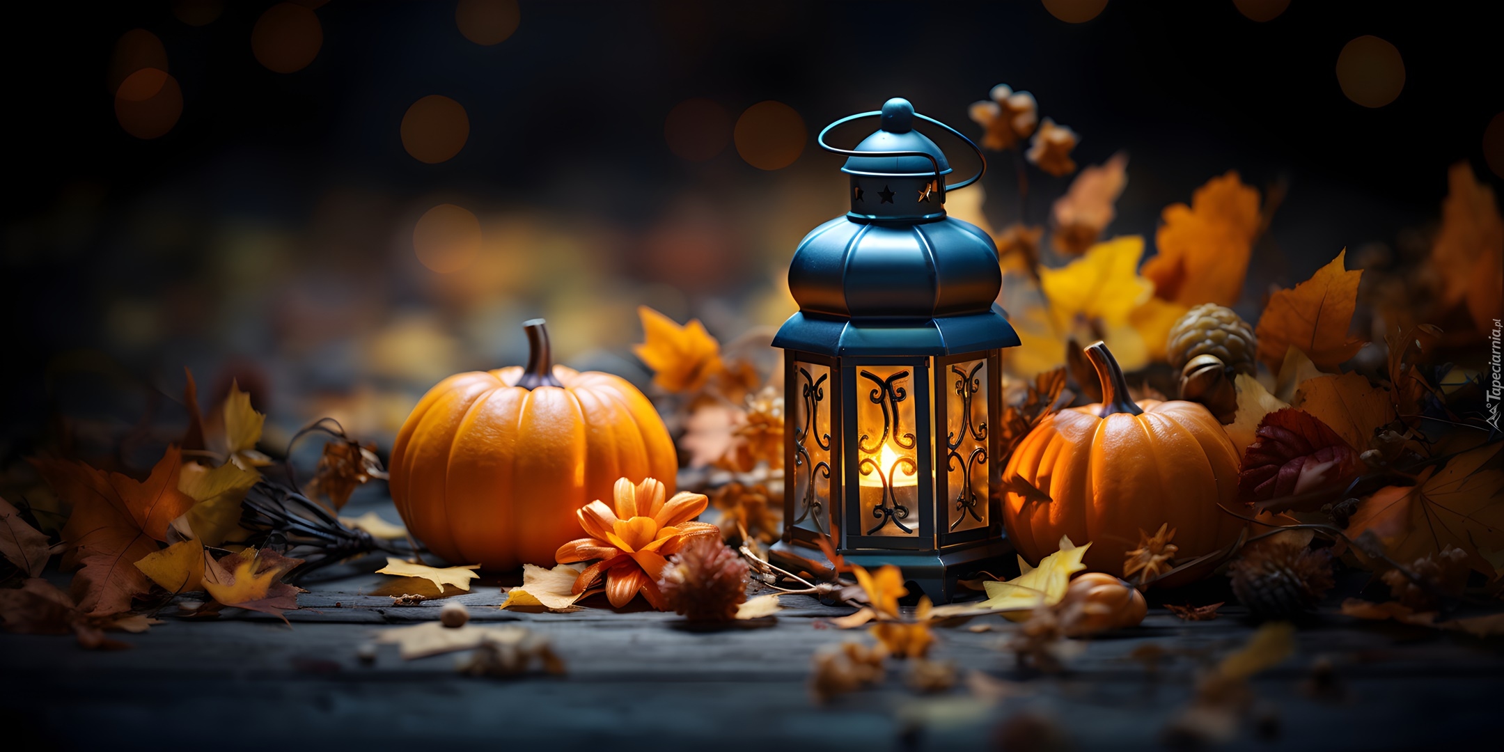 Edytor tapety: Kompozycja jesienna z małymi dyniami obok lampionu