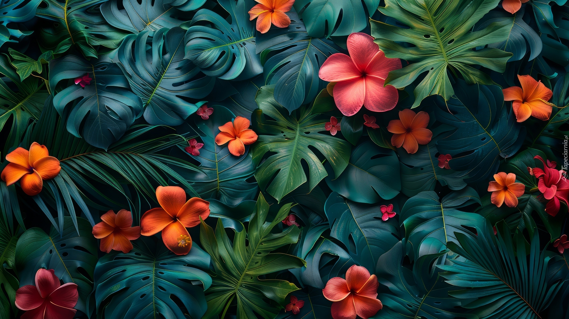 Edytor tapety: Czerwone i pomarańczowe kwiaty na liściach