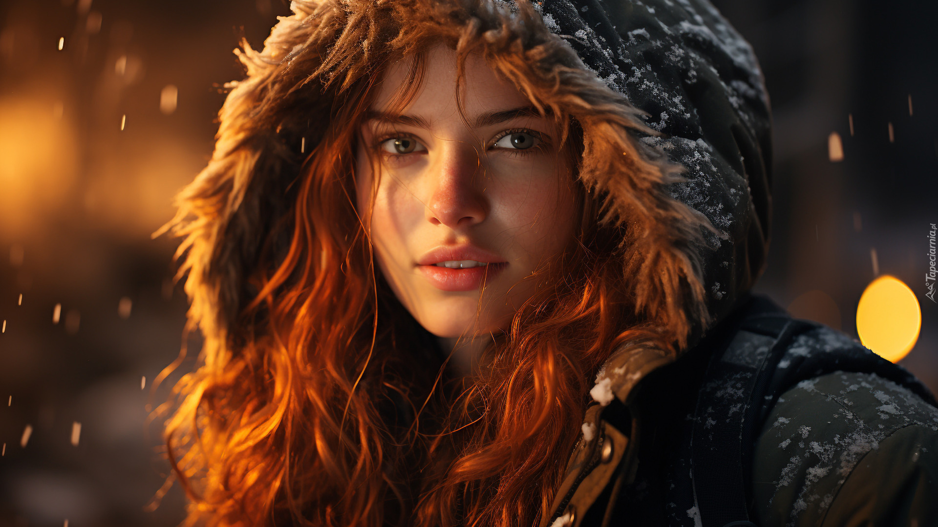 Edytor tapety: Długowłosa ruda dziewczyna w ośnieżonej kurtce z kapturem