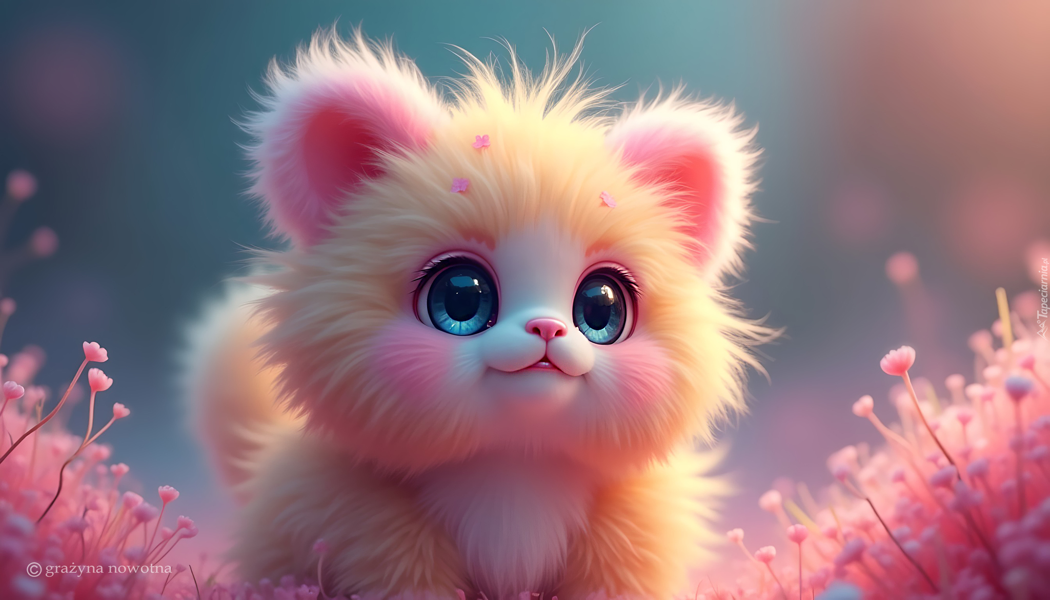 Edytor tapety: Grafika z kolorowym kotem obok kwiatów