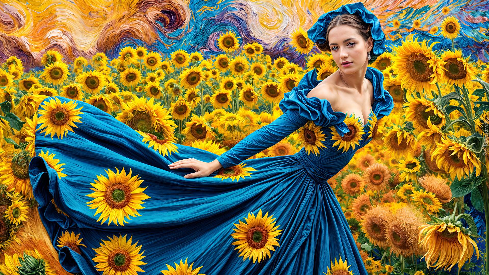 Edytor tapety: Kobieta w niebieskiej sukni wśród słoneczników