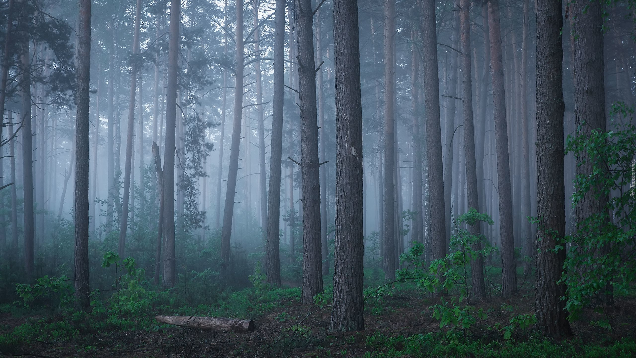 Edytor tapety: Wysokie drzewa iglaste w zamglonym lesie