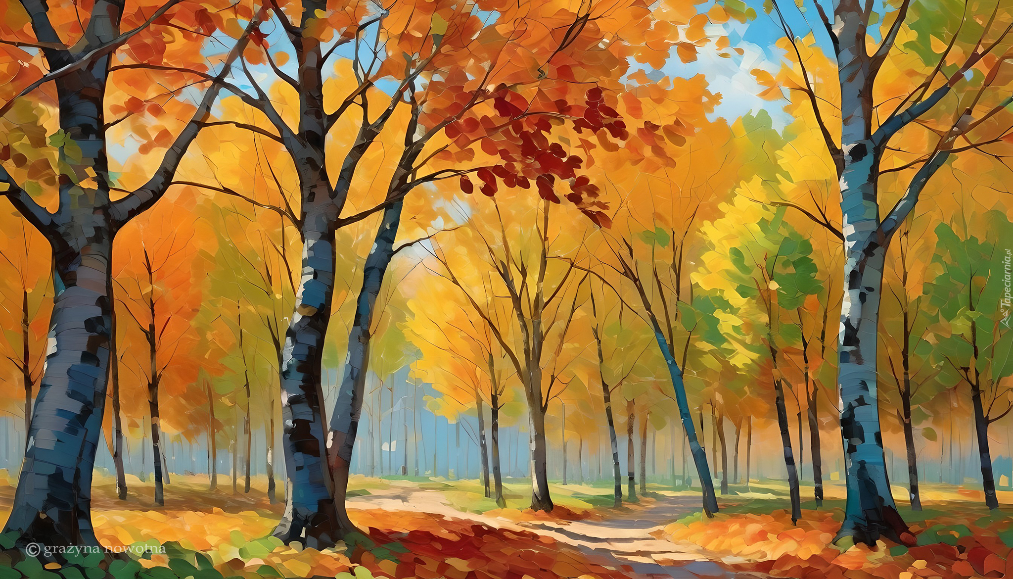 Edytor tapety: Grafika z jesiennymi drzewami w słonecznym lesie