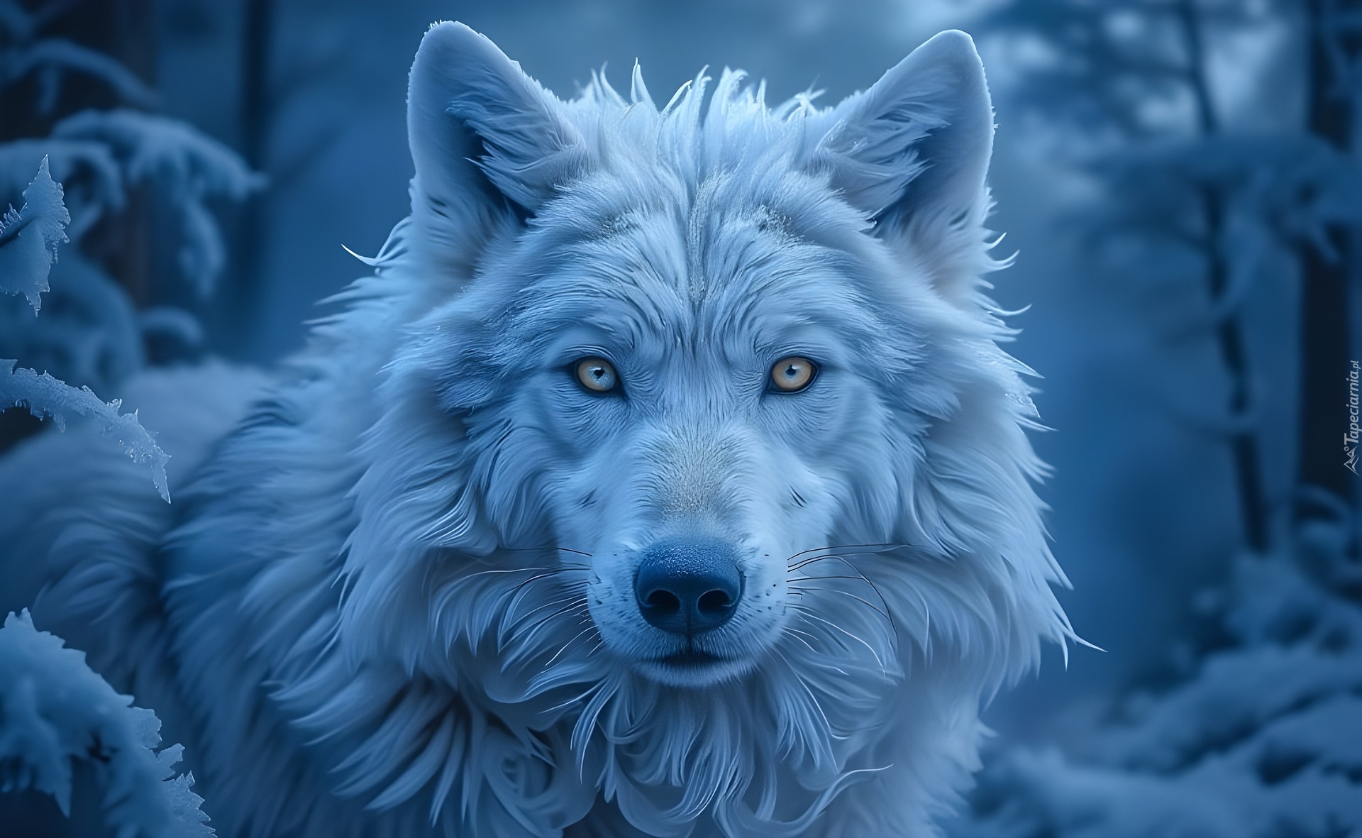 Edytor tapety: Grafika z białym wilkiem w zimowym lesie