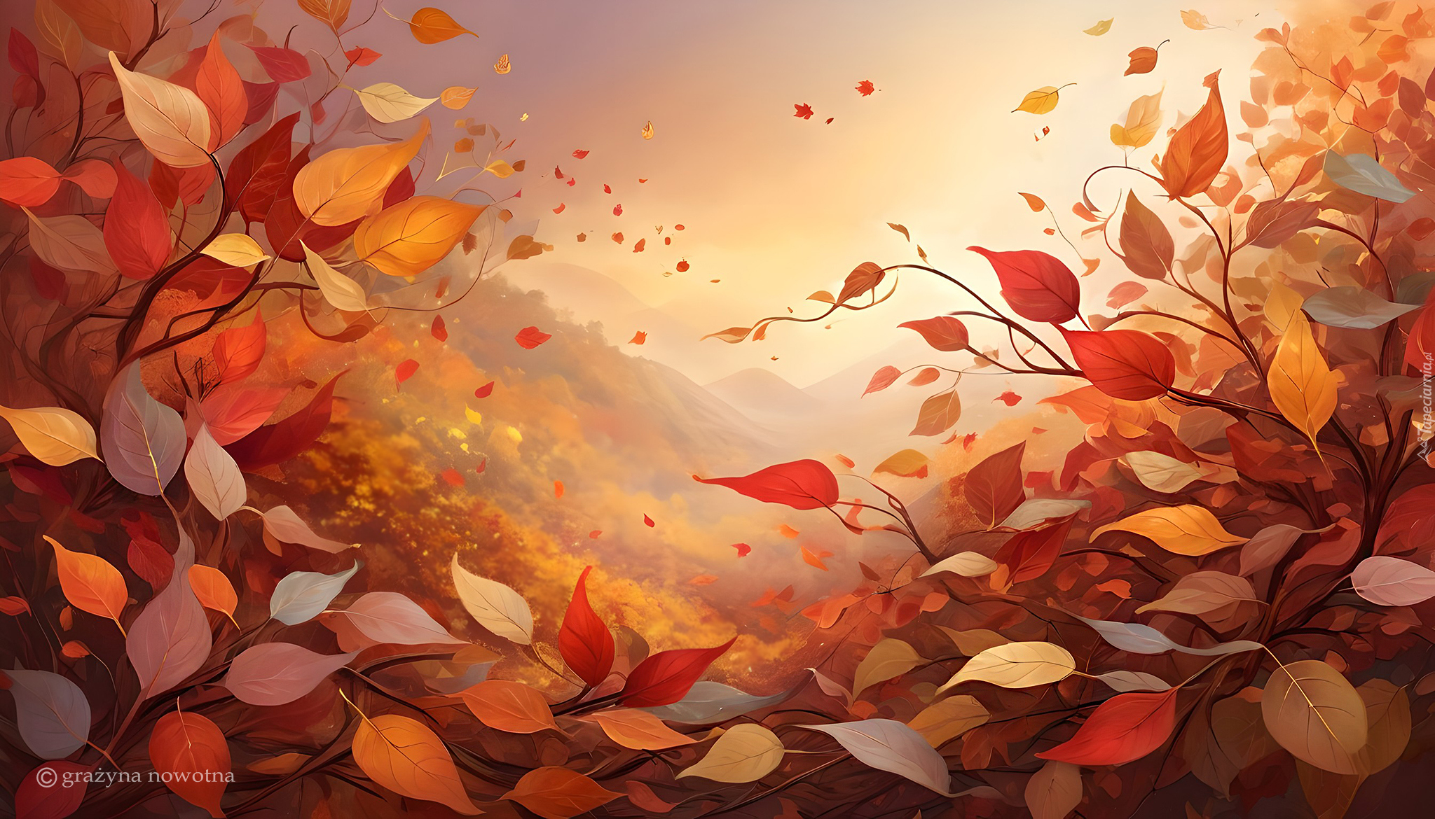Edytor tapety: Gałązki z jesiennymi liśćmi w grafice