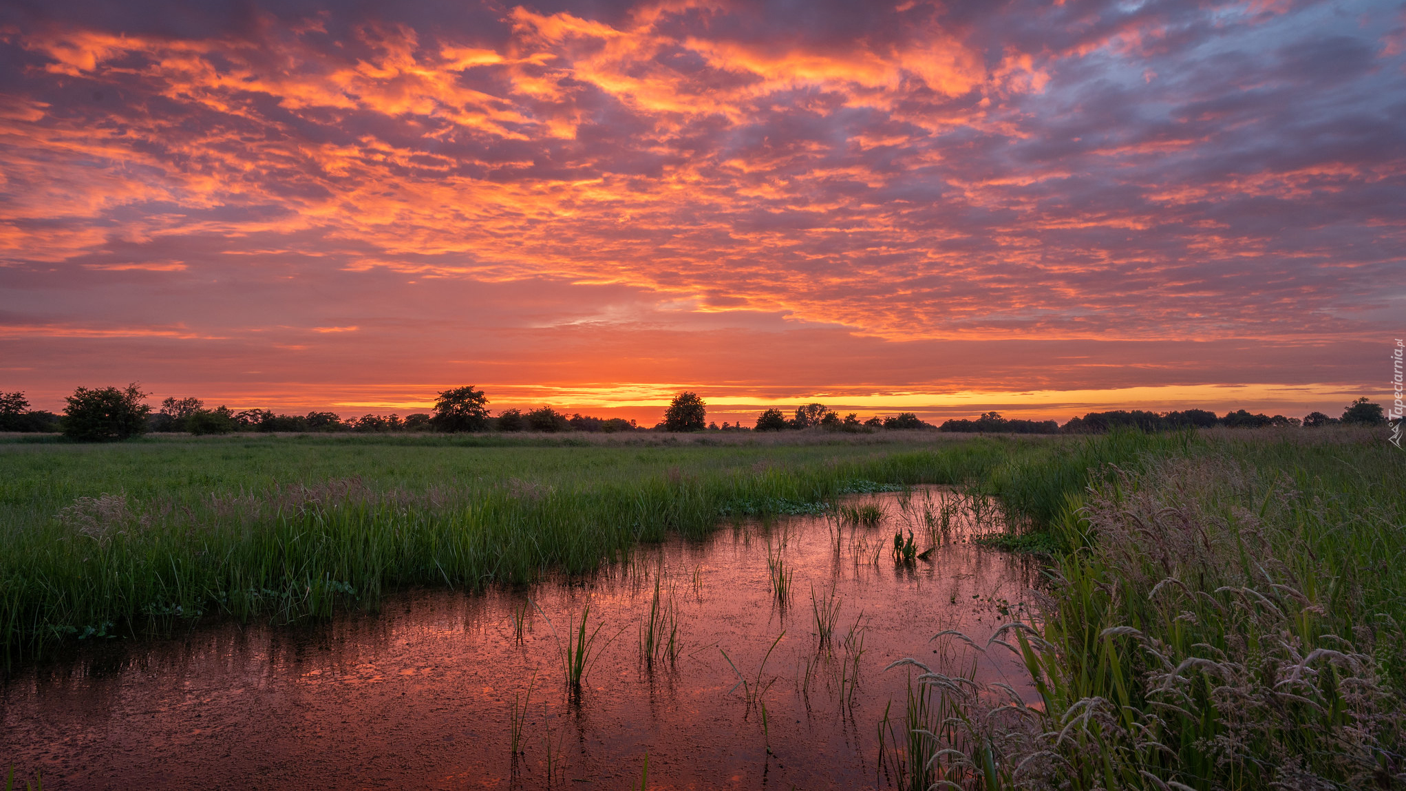 Edytor tapety: Kolorowe niebo zachodzącego słońca nad mokradłami