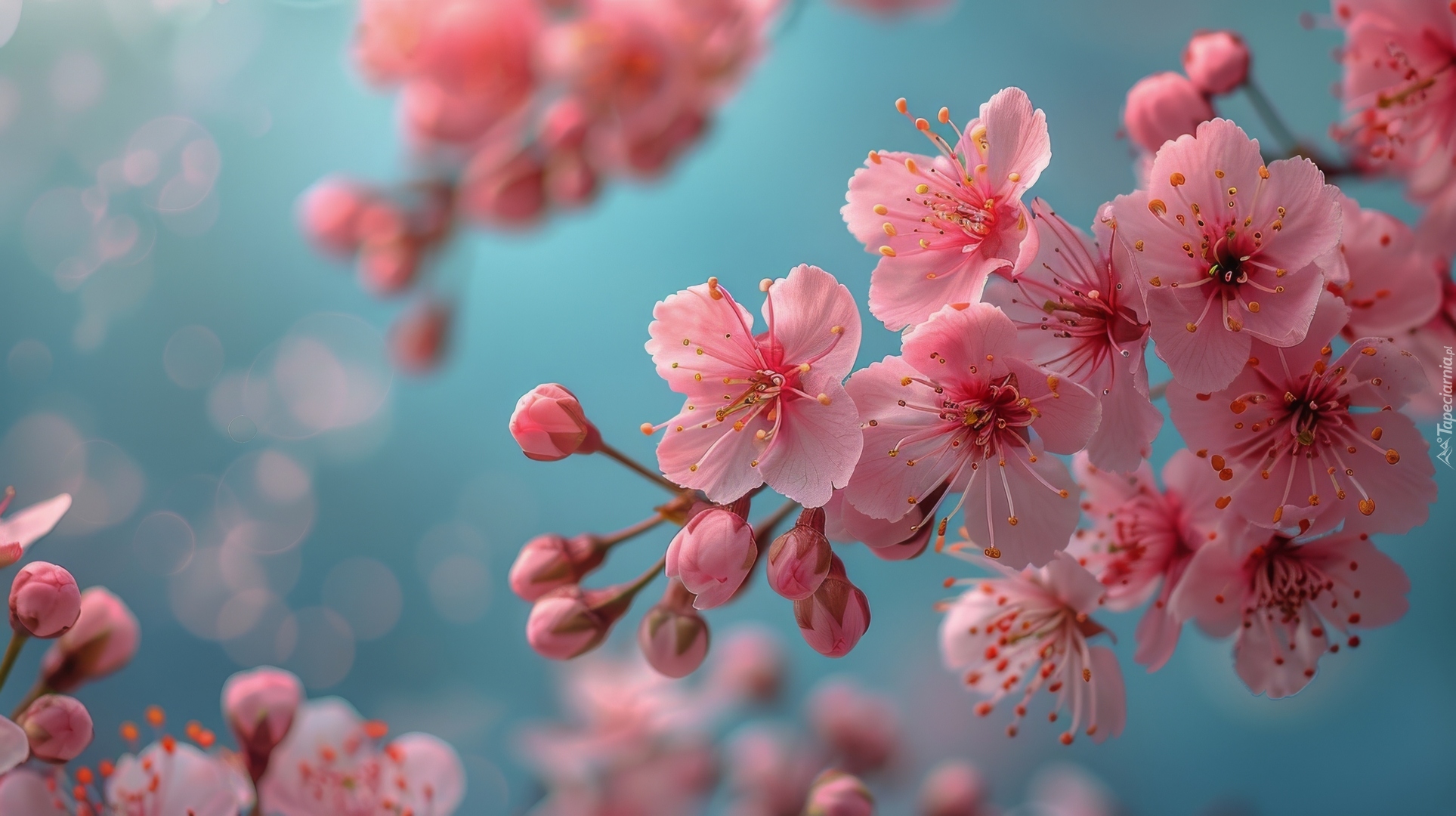 Edytor tapety: Zbliżenie gałązki drzewa owocowego z różowymi kwiatami
