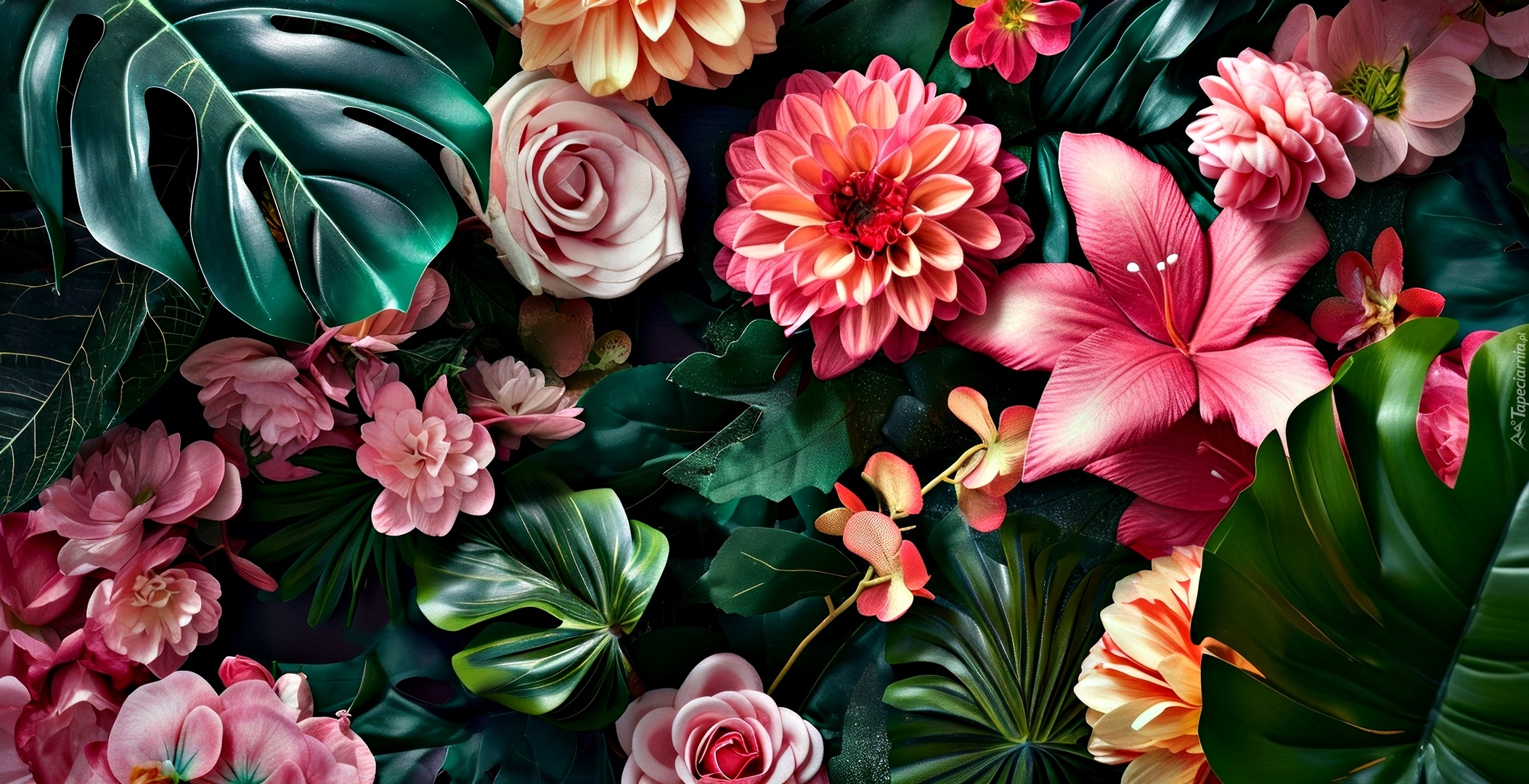 Edytor tapety: Kolorowe kwiaty i zielone liście w grafice