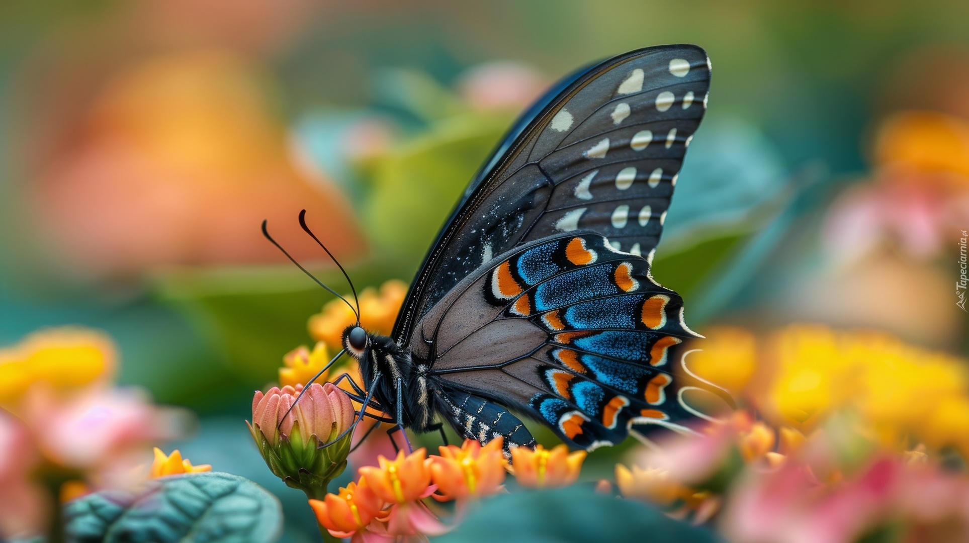 Edytor tapety: Czarno-niebieski motyl na kwiatku