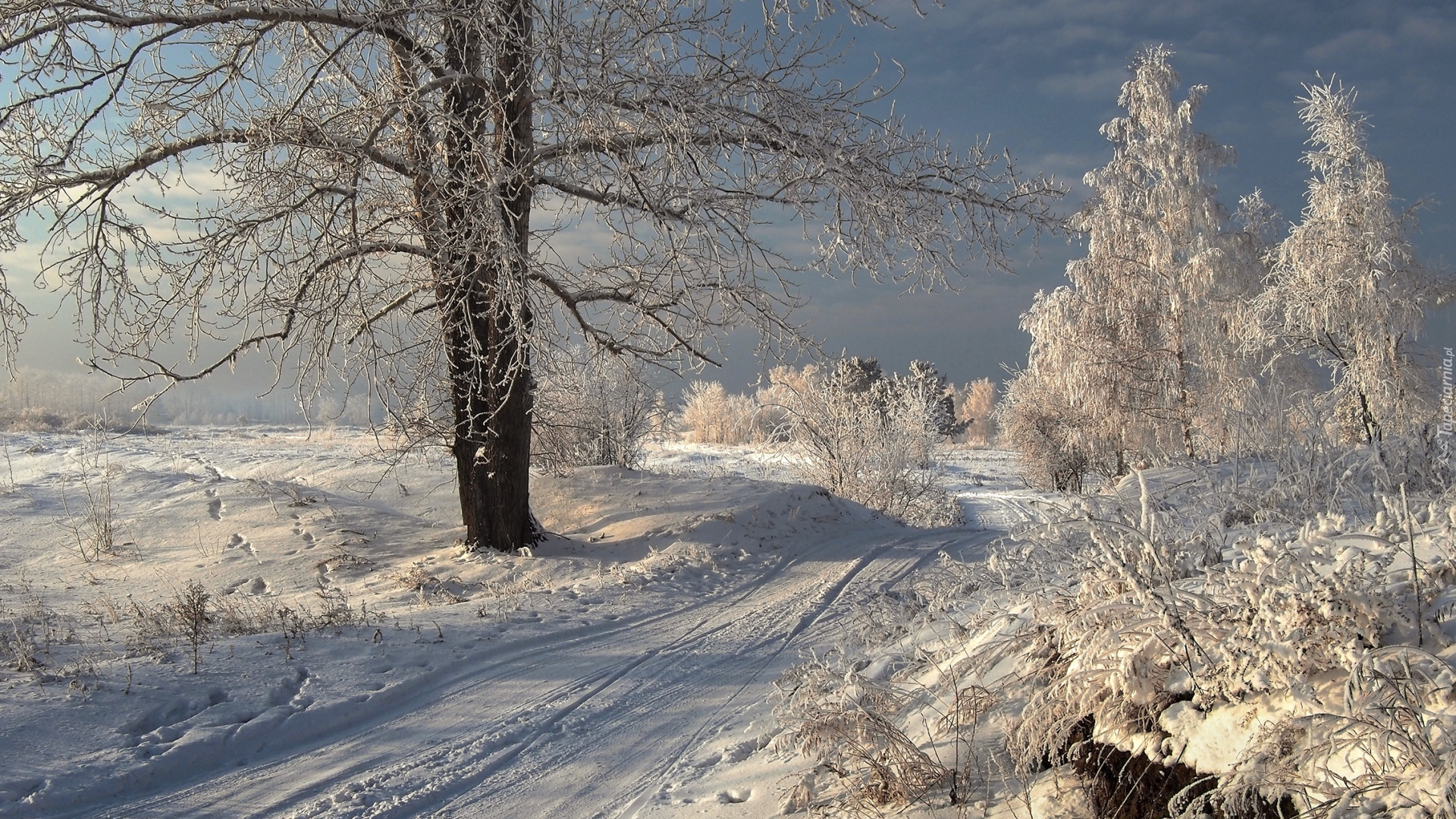 Edytor tapety: Oszronione drzewa i krzewy przy zaśnieżonej drodze