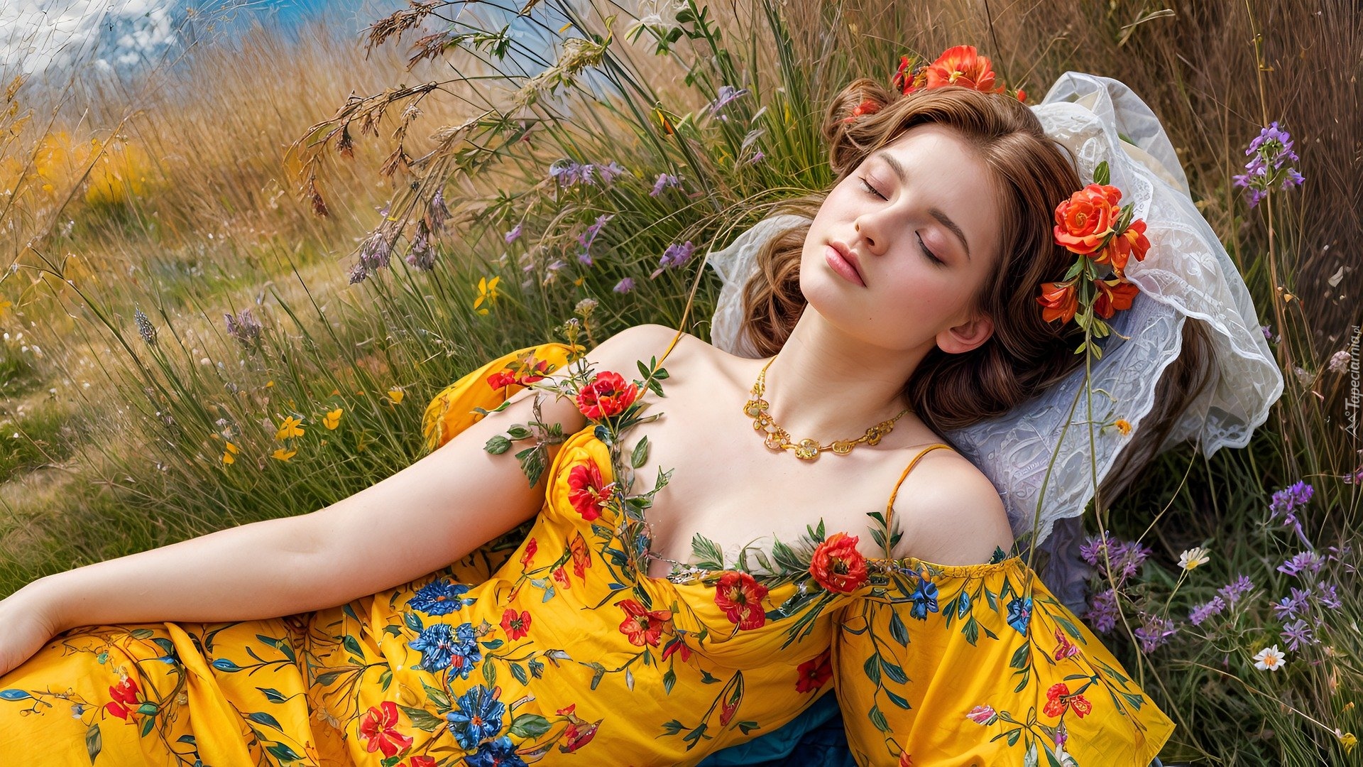 Edytor tapety: Śpiąca kobieta w żółtej sukience na łące