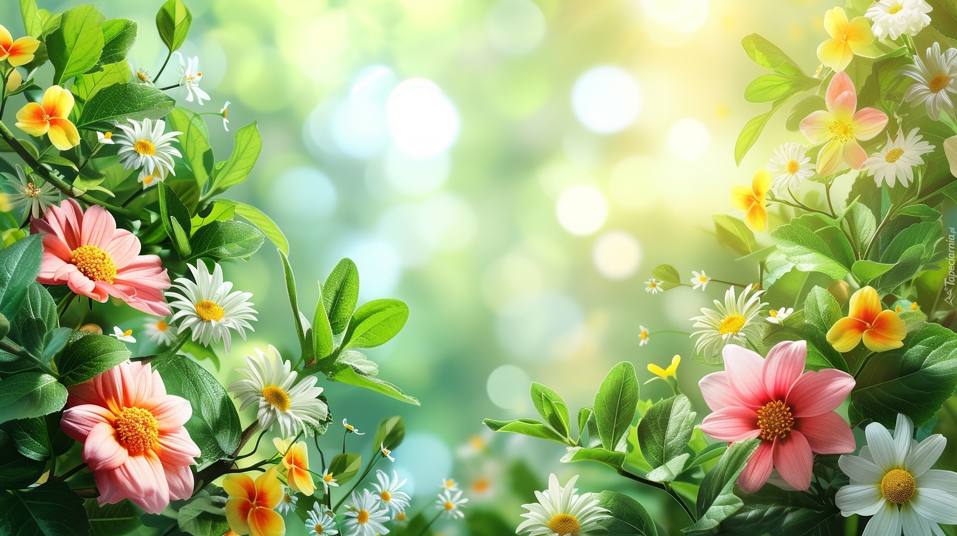 Edytor tapety: Kolorowe kwiaty i liście na rozświetlonym tle