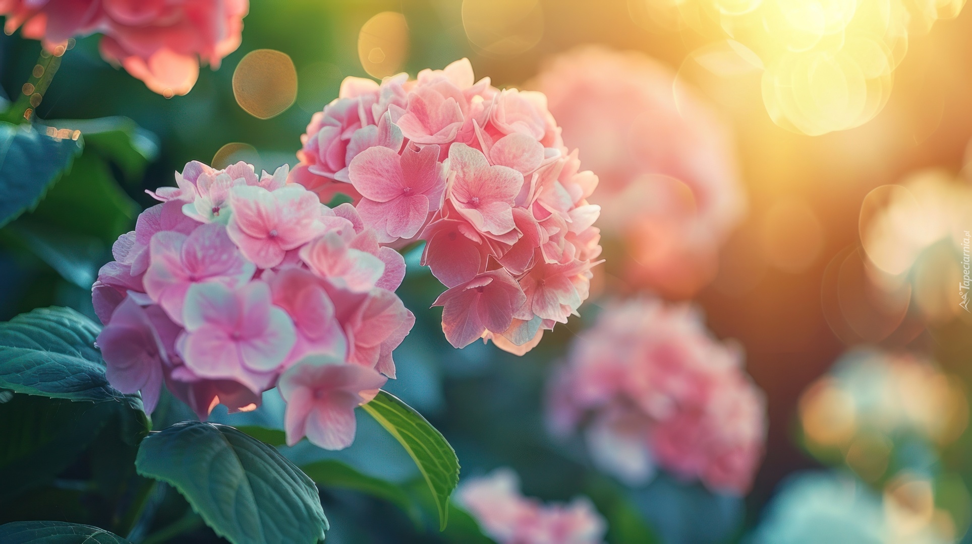 Edytor tapety: Rozświetlone światłem różowe hortensje