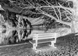 Edytor tapety: Ławka nad jeziorem na tle jesiennych drzew i gór