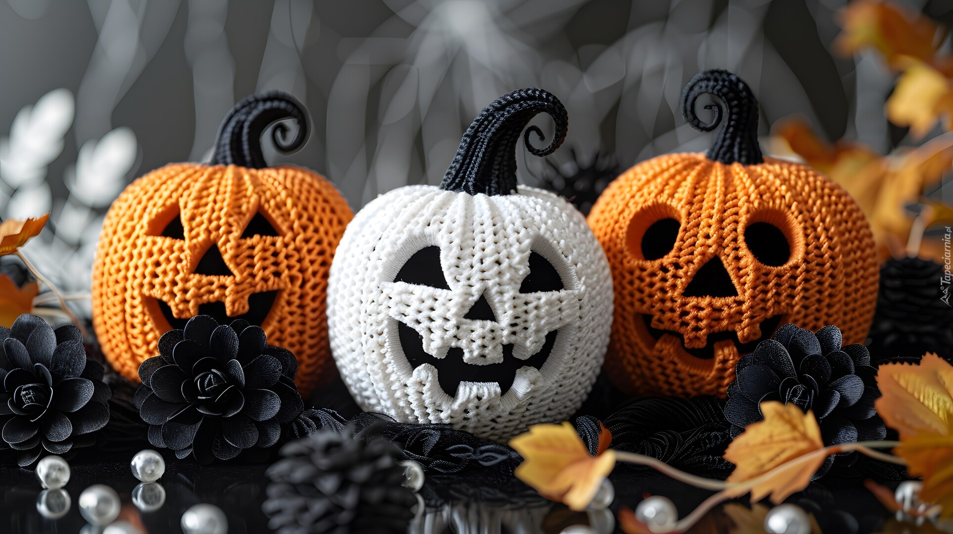 Edytor tapety: Biała i dwie pomarańczowe dynie na czarnych kwiatach