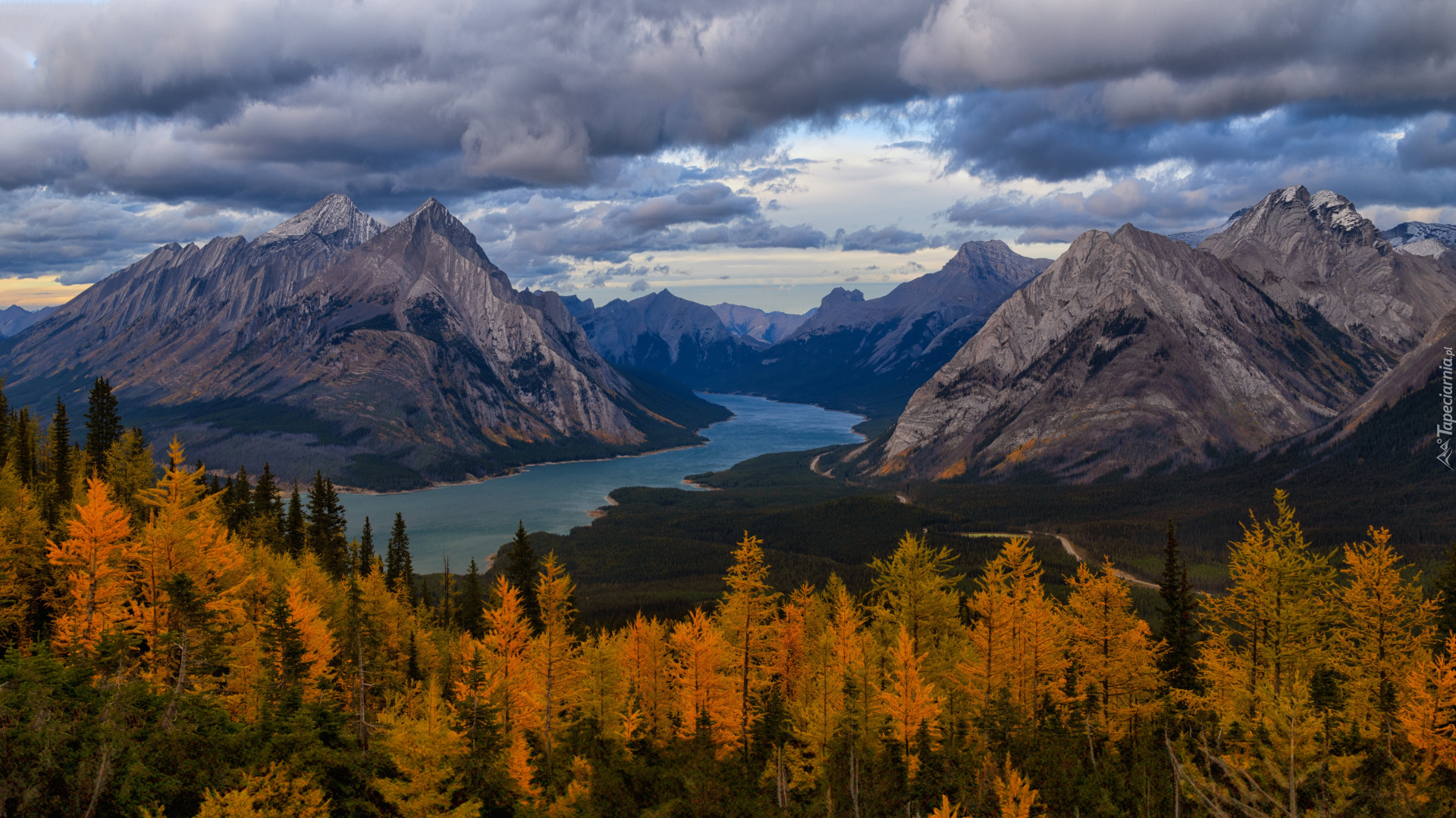 Edytor tapety: Pożółkłe drzewa i górska rzeka pod ciemnymi chmurami