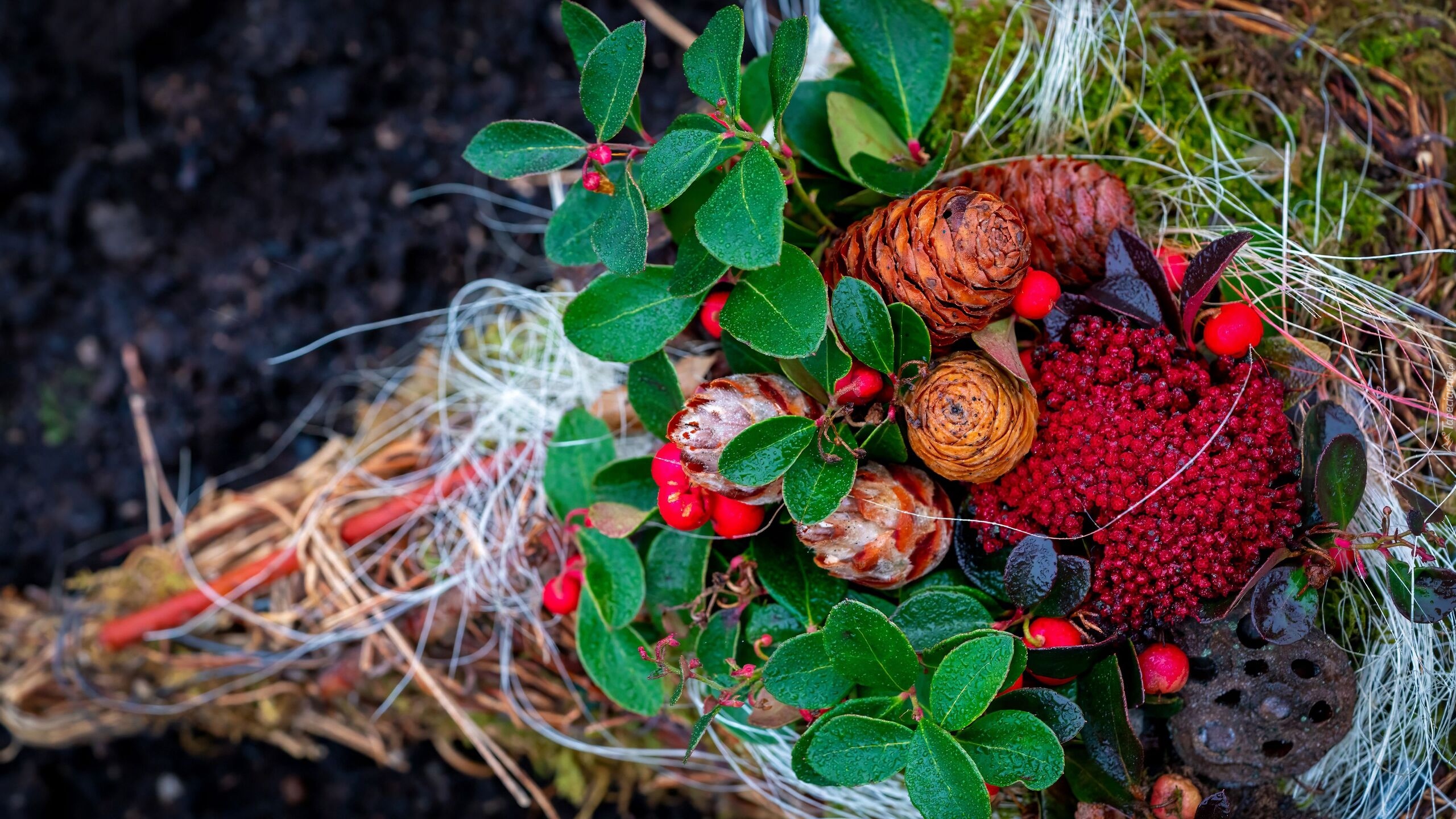 Edytor tapety: Jesienna kompozycja z szyszek owoców i liści