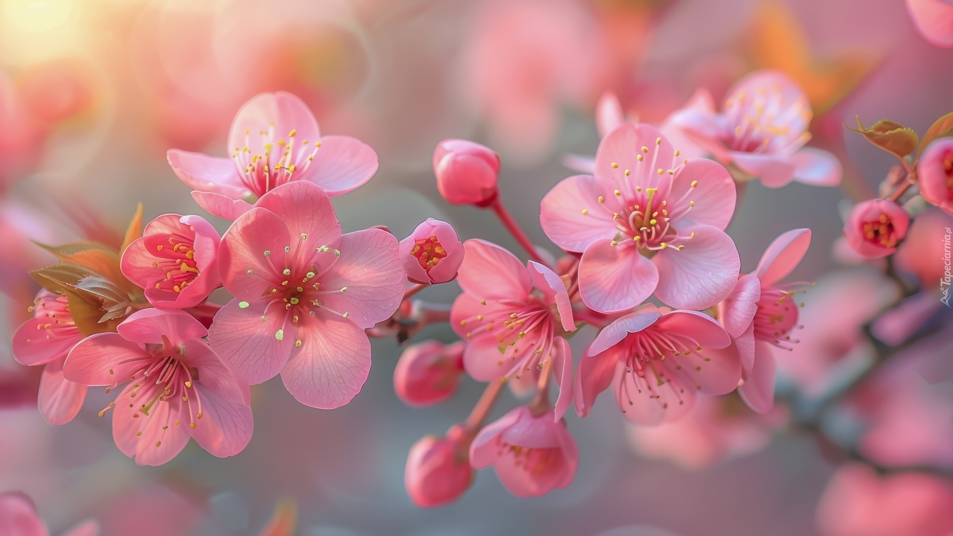 Edytor tapety: Rozświetlona gałązka z różowymi kwiatami drzewa owocowego